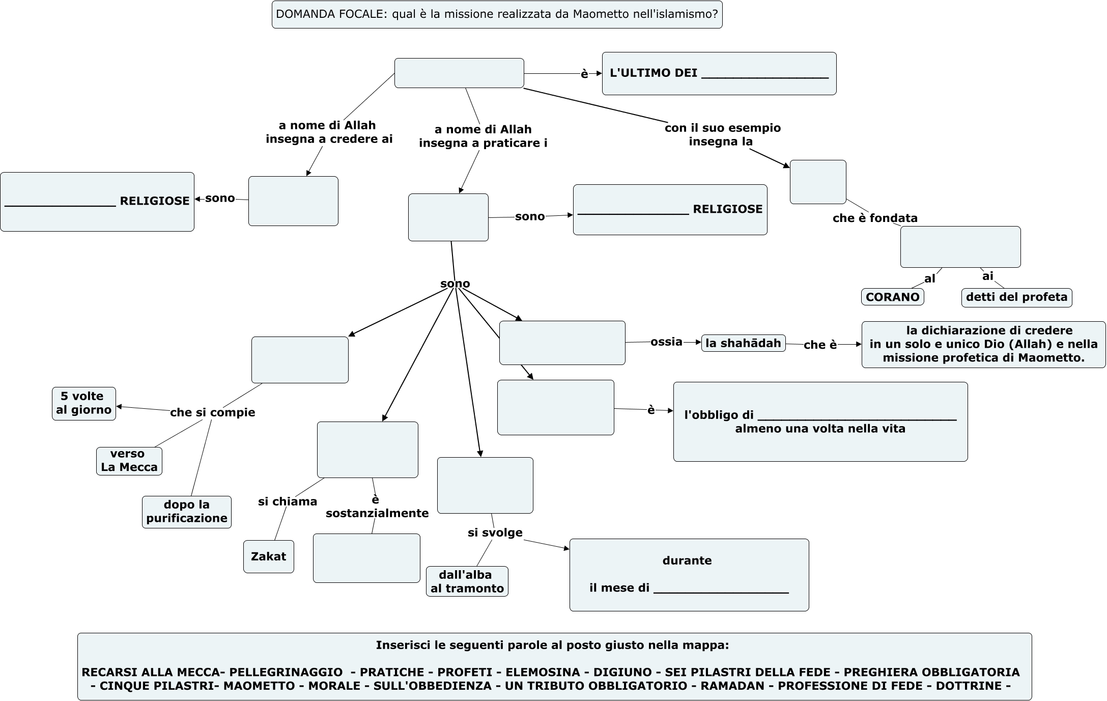 Questa Cmap, creata con IHMC CmapTools, contiene informazioni relative a: Esercitazione sulla missione di Maometto, sono, a nome di Allah insegna a credere ai, a nome di Allah insegna a praticare i, sono ______________ RELIGIOSE, è sostanzialmente, sono, che si compie 5 volte al giorno, la shahādah che è la dichiarazione di credere in un solo e unico Dio (Allah) e nella missione profetica di Maometto., ai detti del profeta, si svolge dall'alba al tramonto, è L'ULTIMO DEI ________________, al CORANO, sono, che è fondata, si chiama Zakat, che si compie verso La Mecca, è l'obbligo di _________________________ almeno una volta nella vita, sono ______________ RELIGIOSE, sono, che si compie dopo la purificazione