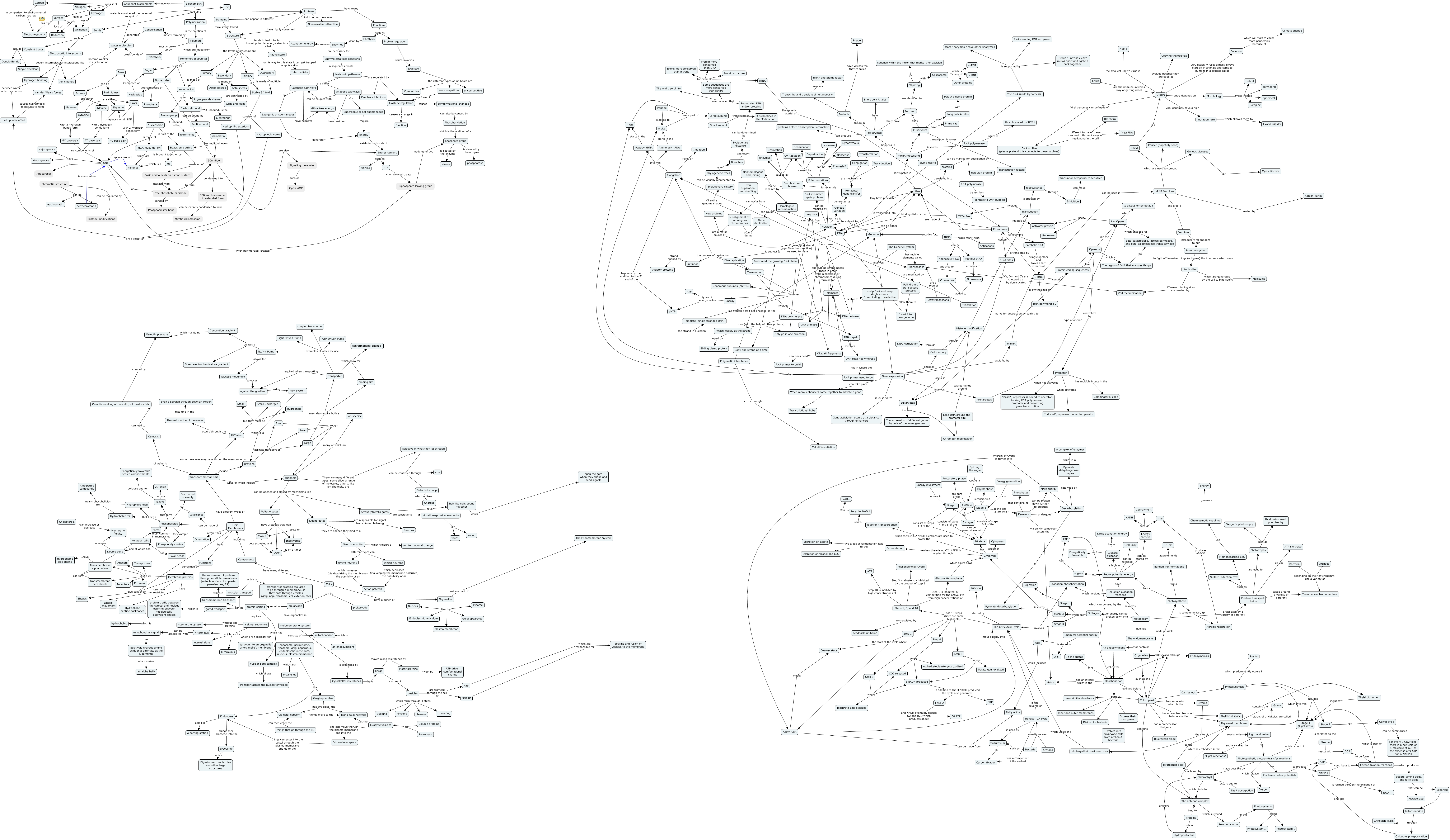 This Concept Map, created with IHMC CmapTools, has information related to: Final, Pyrimidines are either Thymine, Nucleosome is made of H2A, H2B, H3, H4, Proteins have highly conserved Structure, Histone modification occur in Eukaryotes, tRNA sites has P site, comformational changes can also be caused by Phosphorylation, Cargo is stored in Vesicles, Some sequences are more conserved than others for example Exons more conserved than introns, Morphology types include polyhedral, Thermal motion of molecules resulting in the Even dispirsion through Bownian Motion, Redox potential energy can be stored by Energy carriers, Photosynthesis includes Stage 2, Chloroplast ???? Photosynthesis, DNA primase help make Okazaki fragments, Archaea depending on their environemnt, use a variety of Terminal electron acceptors, Secondary is made of Beta sheets, Cis golgi network things move to the Trans golgi network, Energy investment occurs in Stage 1, Hydrophobic tail to the Thylakoid membrane, proteins facilitate transport of Ions