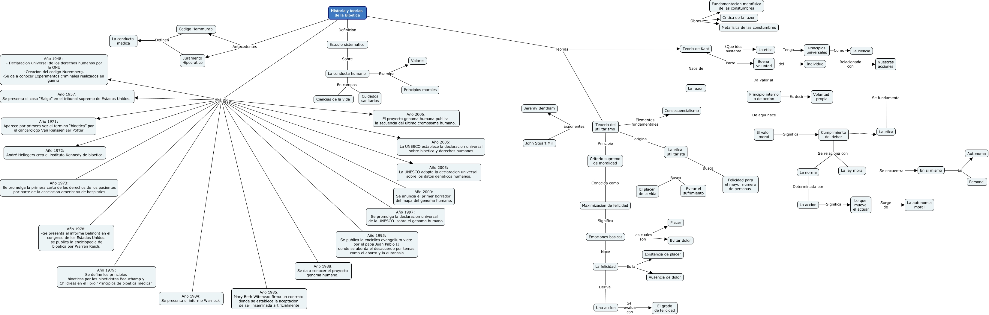 Este Cmap, tiene información relacionada con: Historia y teorias de la bioetica, Buena voluntad del Individuo, Historia y teorias de la Bioetica Definicion Estudio sistematico, Lo que mueve el actuar Surge de La autonomia moral, La norma Determinada por La accion, Historia y teorias de la Bioetica Historia Año 2003: La UNESCO adopta la declaracion universal sobre los datos geneticos humanos., Cumplimiento del deber La etica, El valor moral Significa Cumplimiento del deber, Principio interno o de accion De aqui nace El valor moral, Historia y teorias de la Bioetica Historia Año 1957: Se presenta el caso “Salgo” en el tribunal supremo de Estados Unidos., Teoeria del utilitarismo Exponentes Jeremy Bentham, Historia y teorias de la Bioetica Historia Año 1988: Se da a conocer el proyecto genoma humano., Codigo Hammurabi Definen La conducta medica, Emociones basicas Las cuales son Placer, Historia y teorias de la Bioetica Historia Año 1948: - Declaracion universal de los derechos humanos por la ONU -Creacion del codigo Nuremberg. -Se da a conocer Experimentos criminales realizados en guerra, Estudio sistematico Sobre La conducta humano, Cumplimiento del deber Se relaciona con La ley moral, La felicidad Es la Ausencia de dolor, La conducta humano Examina Principios morales, Historia y teorias de la Bioetica Historia Año 1978: -Se presenta el informe Belmont en el congreso de los Estados Unidos. -se publica la enciclopedia de bioetica por Warren Reich., Historia y teorias de la Bioetica Historia Año 1995: Se publica la enciclica evangelium viate por el papa Juan Pablo II donde se aborda el desacuerdo por temas como el aborto y la eutanasia