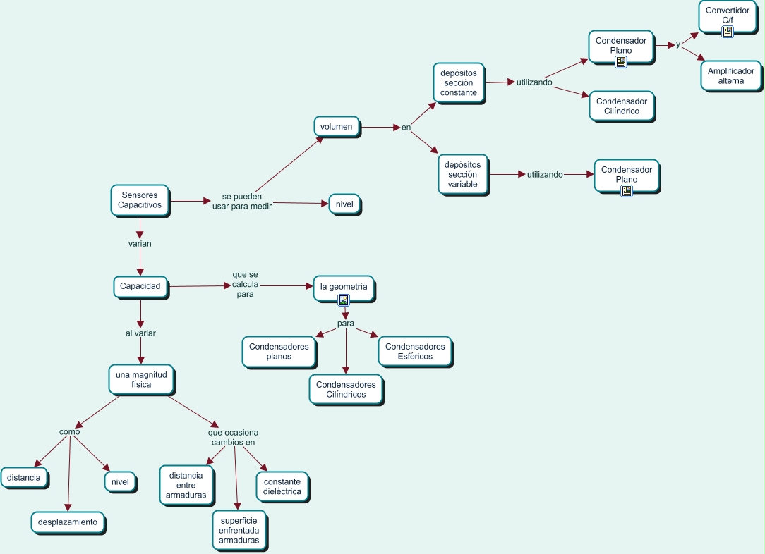 Este Cmap, tiene información relacionada con: 1.- Sensores Capacitivos, Capacidad al variar una magnitud física, una magnitud física que ocasiona cambios en distancia entre armaduras, volumen en depósitos sección variable, una magnitud física como nivel, Condensador Plano y Amplificador alterna, una magnitud física que ocasiona cambios en superficie enfrentada armaduras, volumen en depósitos sección constante, una magnitud física como distancia, Capacidad que se calcula para la geometría, depósitos sección constante utilizando Condensador Cilíndrico, Sensores Capacitivos varian Capacidad, Condensador Plano y Convertidor C/f, Sensores Capacitivos se pueden usar para medir nivel, una magnitud física como desplazamiento, depósitos sección constante utilizando Condensador Plano, depósitos sección variable utilizando Condensador Plano, la geometría para Condensadores Esféricos, la geometría para Condensadores planos, la geometría para Condensadores Cilíndricos, una magnitud física que ocasiona cambios en constante dieléctrica