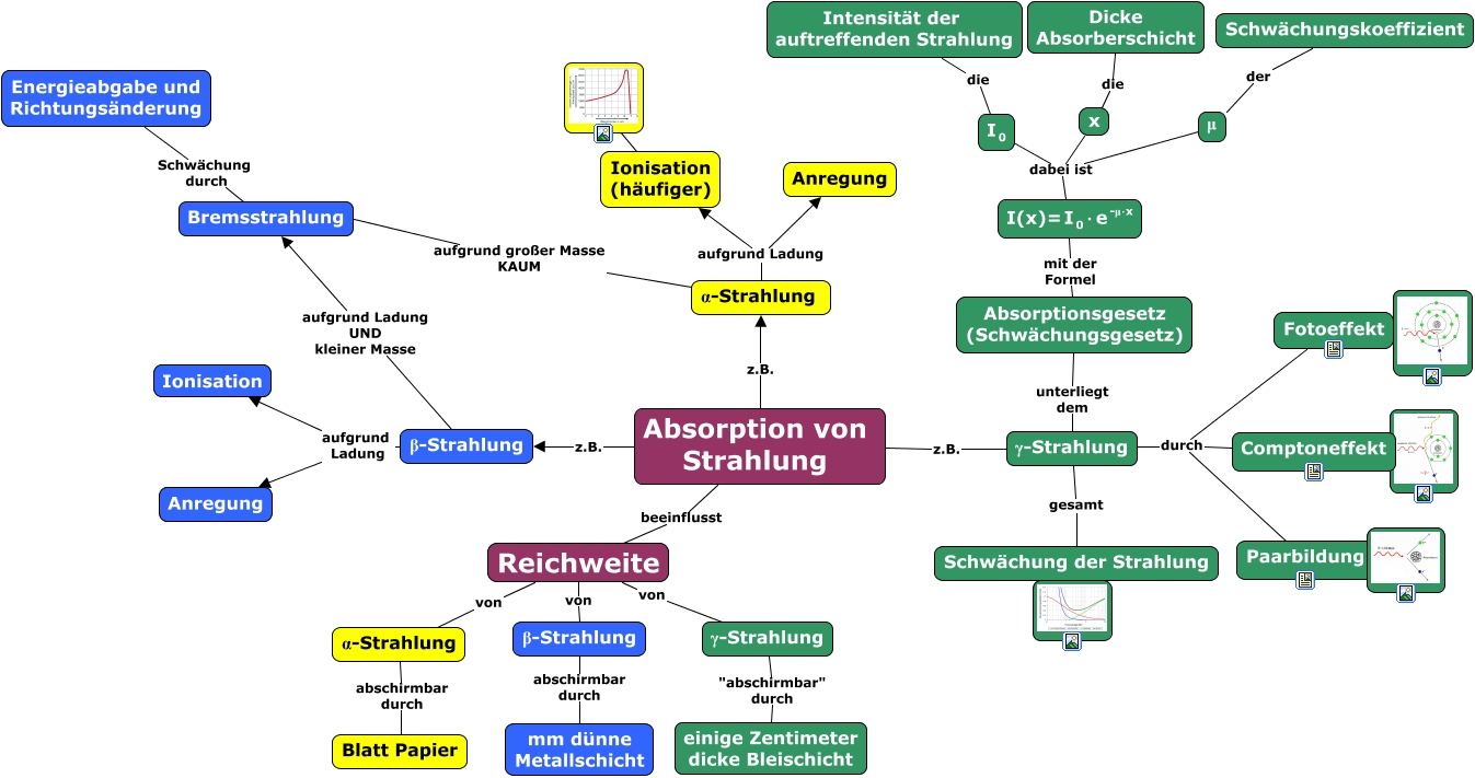 Dieses mit IHMC CmapTools erstellte CMap hat Informationen bezüglich: Absorption und Reichweite radioaktiver Strahlung, γ-Strahlung durch Paarbildung, Absorption von Strahlung z.B. γ-Strahlung, Absorption von Strahlung beeinflusst Reichweite, α-Strahlung aufgrund Ladung Anregung, β-Strahlung aufgrund Ladung UND kleiner Masse Bremsstrahlung, γ-Strahlung unterliegt dem Absorptionsgesetz (Schwächungsgesetz), α-Strahlung abschirmbar durch Blatt Papier, γ-Strahlung gesamt Schwächung der Strahlung, α-Strahlung aufgrund großer Masse KAUM Bremsstrahlung, Schwächung der Strahlung ????, β-Strahlung abschirmbar durch mm dünne Metallschicht, β-Strahlung aufgrund Ladung Anregung, Absorptionsgesetz (Schwächungsgesetz) mit der Formel <math xmlns="http://www.w3.org/1998/Math/MathML"> <mrow> <mtext> I(x)= </mtext> <mmultiscripts> <mtext> I </mtext> <mtext> 0 </mtext> <none/> </mmultiscripts> <mtext> ⋅ </mtext> <mmultiscripts> <mtext> e </mtext> <none/> <mtext> -μ⋅x </mtext> </mmultiscripts> </mrow> </math>, γ-Strahlung durch Comptoneffekt, <math xmlns="http://www.w3.org/1998/Math/MathML"> <mrow> <mtext> I(x)= </mtext> <mmultiscripts> <mtext> I </mtext> <mtext> 0 </mtext> <none/> </mmultiscripts> <mtext> ⋅ </mtext> <mmultiscripts> <mtext> e </mtext> <none/> <mtext> -μ⋅x </mtext> </mmultiscripts> </mrow> </math> dabei ist μ, Reichweite von α-Strahlung, Bremsstrahlung Schwächung durch Energieabgabe und Richtungsänderung, γ-Strahlung durch Fotoeffekt, <math xmlns="http://www.w3.org/1998/Math/MathML"> <mrow> <mmultiscripts> <mtext> I </mtext> <mtext> 0 </mtext> <none/> </mmultiscripts> </mrow> </math> die Intensität der auftreffenden Strahlung, Absorption von Strahlung z.B. β-Strahlung