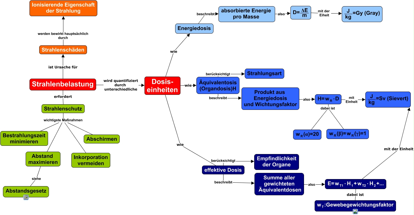 Dieses mit IHMC CmapTools erstellte CMap hat Informationen bezüglich: Strahlenbelastung und Strahlenschutz, Äquivalentosis (Organdosis)H beschreibt Produkt aus Energiedosis und Wichtungsfaktor, Dosis- einheiten wie effektive Dosis, Äquivalentosis (Organdosis)H berücksichtigt Strahlungsart, <math xmlns="http://www.w3.org/1998/Math/MathML"> <mrow> <mtext> E= </mtext> <mmultiscripts> <mtext> w </mtext> <mtext> T1 </mtext> <none/> </mmultiscripts> <mtext> ⋅ </mtext> <mmultiscripts> <mtext> H </mtext> <mtext> 1 </mtext> <none/> </mmultiscripts> <mtext> + </mtext> <mmultiscripts> <mtext> w </mtext> <mtext> T2 </mtext> <none/> </mmultiscripts> <mtext> ⋅ </mtext> <mmultiscripts> <mtext> H </mtext> <mtext> 2 </mtext> <none/> </mmultiscripts> <mtext> +... </mtext> </mrow> </math> mit der Einheit <math xmlns="http://www.w3.org/1998/Math/MathML"> <mrow> <mfrac> <mtext> J </mtext> <mtext> kg </mtext> </mfrac> <mtext> =Sv (Sievert) </mtext> </mrow> </math>, effektive Dosis berücksichtigt Empfindlichkeit der Organe, Dosis- einheiten wie Energiedosis, <math xmlns="http://www.w3.org/1998/Math/MathML"> <mrow> <mtext> D= </mtext> <mfrac> <mtext> ΔE </mtext> <mtext> m </mtext> </mfrac> </mrow> </math> mit der Eiheit <math xmlns="http://www.w3.org/1998/Math/MathML"> <mrow> <mfrac> <mtext> J </mtext> <mtext> kg </mtext> </mfrac> <mtext> =Gy (Gray) </mtext> </mrow> </math>, Strahlenbelastung ist Ursache für Strahlenschäden, Strahlenbelastung wird quantifiziert durch unterschiedliche Dosis- einheiten, <math xmlns="http://www.w3.org/1998/Math/MathML"> <mrow> <mtext> H= </mtext> <mmultiscripts> <mtext> w </mtext> <mtext> R </mtext> <none/> </mmultiscripts> <mtext> ⋅D </mtext> </mrow> </math> dabei ist <math xmlns="http://www.w3.org/1998/Math/MathML"> <mrow> <mmultiscripts> <mtext> w </mtext> <mtext> R </mtext> <none/> </mmultiscripts> <mtext> (α)=20 </mtext> </mrow> </math>, Strahlenschutz wichtigste Maßnahmen Abschirmen, Energiedosis beschreibt absorbierte Energie pro Masse, Strahlenschutz wichtigste Maßnahmen Bestrahlungszeit minimieren, Strahlenschutz wichtigste Maßnahmen Abstand maximieren, Summe aller gewichteten Äquivalentdosen also <math xmlns="http://www.w3.org/1998/Math/MathML"> <mrow> <mtext> E= </mtext> <mmultiscripts> <mtext> w </mtext> <mtext> T1 </mtext> <none/> </mmultiscripts> <mtext> ⋅ </mtext> <mmultiscripts> <mtext> H </mtext> <mtext> 1 </mtext> <none/> </mmultiscripts> <mtext> + </mtext> <mmultiscripts> <mtext> w </mtext> <mtext> T2 </mtext> <none/> </mmultiscripts> <mtext> ⋅ </mtext> <mmultiscripts> <mtext> H </mtext> <mtext> 2 </mtext> <none/> </mmultiscripts> <mtext> +... </mtext> </mrow> </math>, absorbierte Energie pro Masse also <math xmlns="http://www.w3.org/1998/Math/MathML"> <mrow> <mtext> D= </mtext> <mfrac> <mtext> ΔE </mtext> <mtext> m </mtext> </mfrac> </mrow> </math>, Produkt aus Energiedosis und Wichtungsfaktor also <math xmlns="http://www.w3.org/1998/Math/MathML"> <mrow> <mtext> H= </mtext> <mmultiscripts> <mtext> w </mtext> <mtext> R </mtext> <none/> </mmultiscripts> <mtext> ⋅D </mtext> </mrow> </math>, effektive Dosis beschreibt Summe aller gewichteten Äquivalentdosen, Dosis- einheiten wie Äquivalentosis (Organdosis)H, Strahlenschäden werden bewirkt hauptsächlich durch Ionisierende Eigenschaft der Strahlung