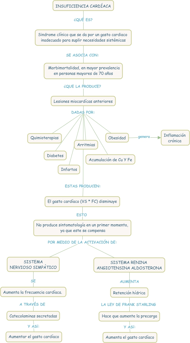 Este Cmap, tiene información relacionada con: FISIOPATOLOGÍA I, Catecolaminas secretadas Y ASí: Aumentar el gasto cardíaco, El gasto cardíaco (VS * FC) disminuye ESTO No produce sintomatología en un primer momento, ya que este se compensa, Sindrome clínico que se da por un gasto cardiaco inadecuado para suplir necesidades sistémicas SE ASOCIA CON: Morbimortalidad, en mayor prevalencia en personas mayores de 70 años, Lesiones miocardícas anteriores DADAS POR: Diabetes, Aumenta la frecuencia cardíaca. A TRAVÉS DE Catecolaminas secretadas, Lesiones miocardícas anteriores DADAS POR: Quimioterapias, SISTEMA NERVIOSO SIMPÁTICO SE Aumenta la frecuencia cardíaca., No produce sintomatología en un primer momento, ya que este se compensa POR MEDIO DE LA ACTIVACIÓN DE: SISTEMA NERVIOSO SIMPÁTICO, Lesiones miocardícas anteriores DADAS POR: Arritmias, Lesiones miocardícas anteriores DADAS POR: Infartos, INSUFICIENCIA CARDÍACA ¿QUÉ ES? Sindrome clínico que se da por un gasto cardiaco inadecuado para suplir necesidades sistémicas, SISTEMA RENINA ANGIOTENSINA ALDOSTERONA AUMENTA Retención hídrica, Lesiones miocardícas anteriores DADAS POR: Obesidad, Lesiones miocardícas anteriores ESTAS PRODUCEN: El gasto cardíaco (VS * FC) disminuye, No produce sintomatología en un primer momento, ya que este se compensa POR MEDIO DE LA ACTIVACIÓN DE: SISTEMA RENINA ANGIOTENSINA ALDOSTERONA, Hace que aumente la precarga Y ASí: Aumenta el gasto cardíaco, Obesidad genera Inflamación crónica, Lesiones miocardícas anteriores DADAS POR: Acumulación de Cu Y Fe, Retención hídrica LA LEY DE FRANK STARLING Hace que aumente la precarga, Morbimortalidad, en mayor prevalencia en personas mayores de 70 años ¿QUE LA PRODUCE? Lesiones miocardícas anteriores