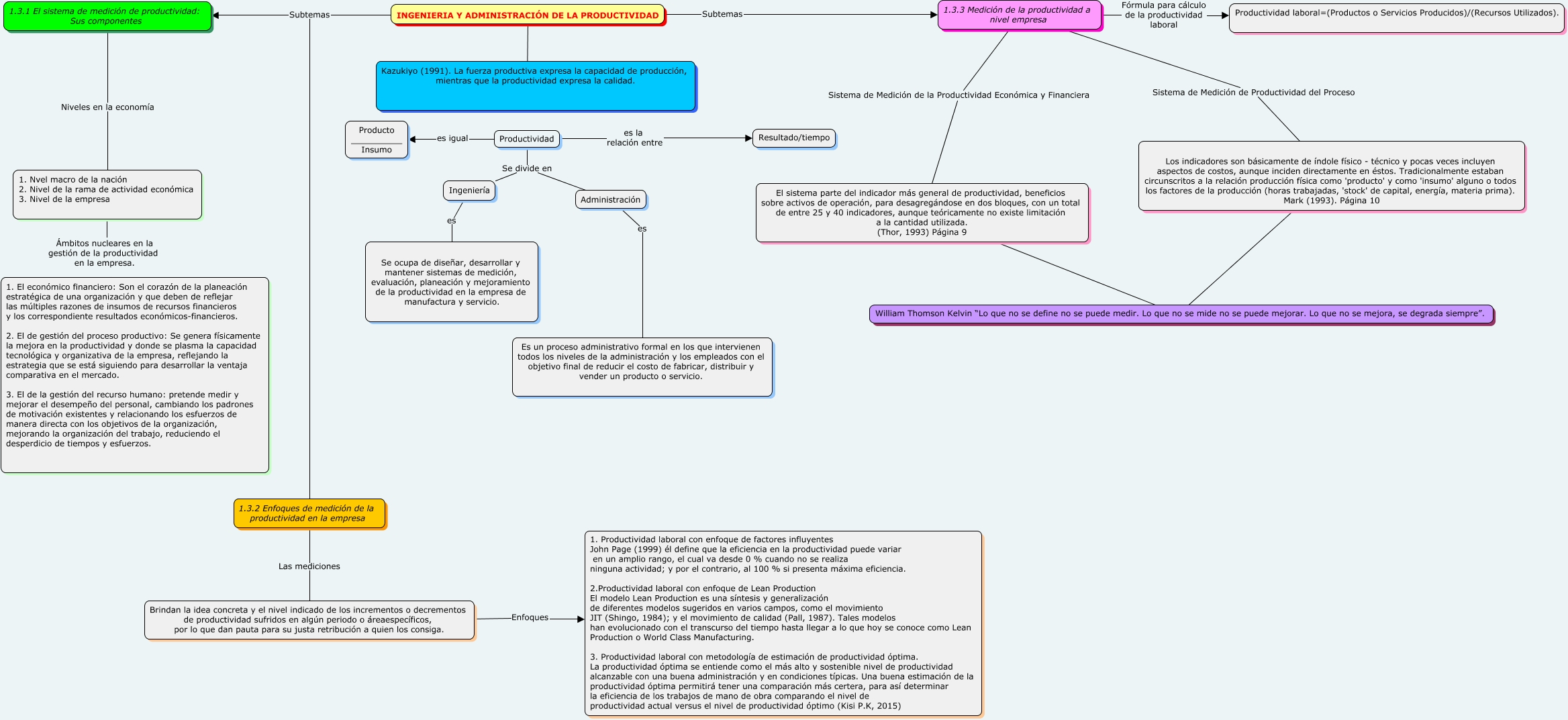 Este Cmap, tiene información relacionada con: CMAP AD CALIDAD 2, El sistema parte del indicador más general de productividad, beneficios sobre activos de operación, para desagregándose en dos bloques, con un total de entre 25 y 40 indicadores, aunque teóricamente no existe limitación a la cantidad utilizada. (Thor, 1993) Página 9 ???? William Thomson Kelvin “Lo que no se define no se puede medir. Lo que no se mide no se puede mejorar. Lo que no se mejora, se degrada siempre”., INGENIERIA Y ADMINISTRACIÓN DE LA PRODUCTIVIDAD Subtemas 1.3.1 El sistema de medición de productividad: Sus componentes, Ingeniería es Se ocupa de diseñar, desarrollar y mantener sistemas de medición, evaluación, planeación y mejoramiento de la productividad en la empresa de manufactura y servicio., Productividad es la relación entre Resultado/tiempo, Administración es Es un proceso administrativo formal en los que intervienen todos los niveles de la administración y los empleados con el objetivo final de reducir el costo de fabricar, distribuir y vender un producto o servicio., Productividad es igual Producto __________ Insumo, 1.3.2 Enfoques de medición de la productividad en la empresa Las mediciones Brindan la idea concreta y el nivel indicado de los incrementos o decrementos de productividad sufridos en algún periodo o áreaespecíficos, por lo que dan pauta para su justa retribución a quien los consiga., INGENIERIA Y ADMINISTRACIÓN DE LA PRODUCTIVIDAD ???? Kazukiyo (1991). La fuerza productiva expresa la capacidad de producción, mientras que la productividad expresa la calidad., 1.3.1 El sistema de medición de productividad: Sus componentes Niveles en la economía 1. Nvel macro de la nación 2. Nivel de la rama de actividad económica 3. Nivel de la empresa, 1. Nvel macro de la nación 2. Nivel de la rama de actividad económica 3. Nivel de la empresa Ámbitos nucleares en la gestión de la productividad en la empresa. 1. El económico financiero: Son el corazón de la planeación estratégica de una organización y que deben de reflejar las múltiples razones de insumos de recursos financieros y los correspondiente resultados económicos-financieros. 2. El de gestión del proceso productivo: Se genera físicamente la mejora en la productividad y donde se plasma la capacidad tecnológica y organizativa de la empresa, reflejando la estrategia que se está siguiendo para desarrollar la ventaja comparativa en el mercado. 3. El de la gestión del recurso humano: pretende medir y mejorar el desempeño del personal, cambiando los padrones de motivación existentes y relacionando los esfuerzos de manera directa con los objetivos de la organización, mejorando la organización del trabajo, reduciendo el desperdicio de tiempos y esfuerzos., Los indicadores son básicamente de índole físico - técnico y pocas veces incluyen aspectos de costos, aunque inciden directamente en éstos. Tradicionalmente estaban circunscritos a la relación producción física como 'producto' y como 'insumo' alguno o todos los factores de la producción (horas trabajadas, 'stock' de capital, energía, materia prima). Mark (1993). Página 10 ???? William Thomson Kelvin “Lo que no se define no se puede medir. Lo que no se mide no se puede mejorar. Lo que no se mejora, se degrada siempre”., INGENIERIA Y ADMINISTRACIÓN DE LA PRODUCTIVIDAD Subtemas 1.3.2 Enfoques de medición de la productividad en la empresa, Brindan la idea concreta y el nivel indicado de los incrementos o decrementos de productividad sufridos en algún periodo o áreaespecíficos, por lo que dan pauta para su justa retribución a quien los consiga. Enfoques 1. Productividad laboral con enfoque de factores influyentes John Page (1999) él define que la eficiencia en la productividad puede variar en un amplio rango, el cual va desde 0 % cuando no se realiza ninguna actividad; y por el contrario, al 100 % si presenta máxima eficiencia. 2.Productividad laboral con enfoque de Lean Production El modelo Lean Production es una síntesis y generalización de diferentes modelos sugeridos en varios campos, como el movimiento JIT (Shingo, 1984); y el movimiento de calidad (Pall, 1987). Tales modelos han evolucionado con el transcurso del tiempo hasta llegar a lo que hoy se conoce como Lean Production o World Class Manufacturing. 3. Productividad laboral con metodología de estimación de productividad óptima. La productividad óptima se entiende como el más alto y sostenible nivel de productividad alcanzable con una buena administración y en condiciones típicas. Una buena estimación de la productividad óptima permitirá tener una comparación más certera, para así determinar la eficiencia de los trabajos de mano de obra comparando el nivel de productividad actual versus el nivel de productividad óptimo (Kisi P.K, 2015), INGENIERIA Y ADMINISTRACIÓN DE LA PRODUCTIVIDAD Subtemas 1.3.3 Medición de la productividad a nivel empresa, Productividad Se divide en Ingeniería, 1.3.3 Medición de la productividad a nivel empresa Sistema de Medición de Productividad del Proceso Los indicadores son básicamente de índole físico - técnico y pocas veces incluyen aspectos de costos, aunque inciden directamente en éstos. Tradicionalmente estaban circunscritos a la relación producción física como 'producto' y como 'insumo' alguno o todos los factores de la producción (horas trabajadas, 'stock' de capital, energía, materia prima). Mark (1993). Página 10, 1.3.3 Medición de la productividad a nivel empresa Fórmula para cálculo de la productividad laboral Productividad laboral=(Productos o Servicios Producidos)/(Recursos Utilizados)., 1.3.3 Medición de la productividad a nivel empresa Sistema de Medición de la Productividad Económica y Financiera El sistema parte del indicador más general de productividad, beneficios sobre activos de operación, para desagregándose en dos bloques, con un total de entre 25 y 40 indicadores, aunque teóricamente no 