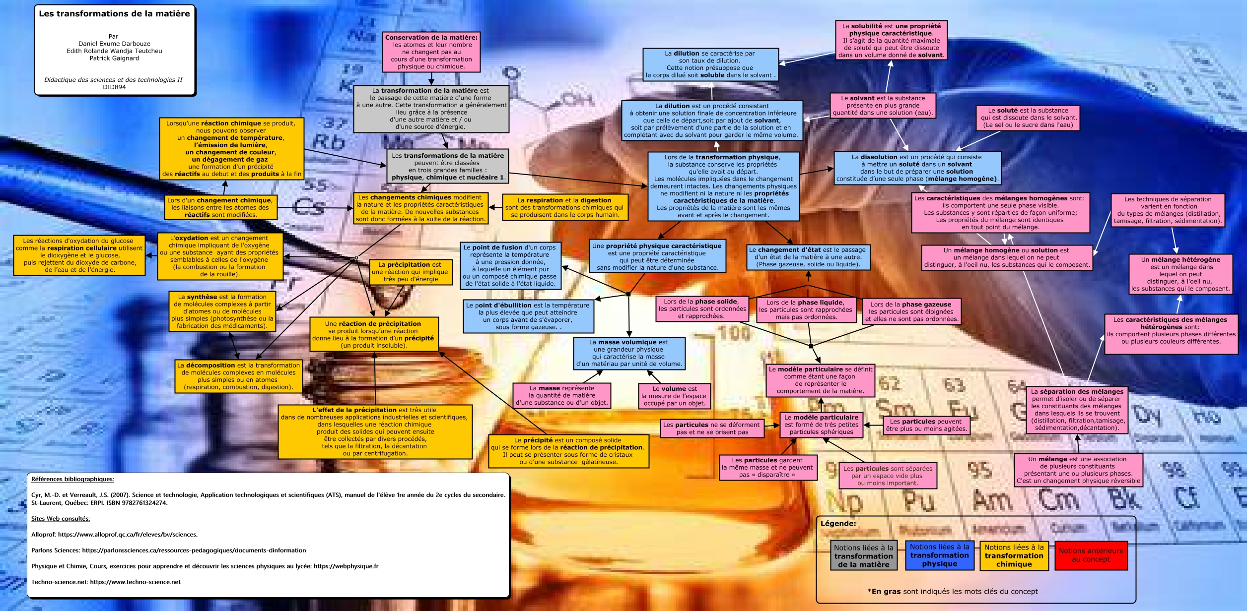 Cette carte de concepts créée avec IHMC CmapTools traite de: Équipe 2 Travail 1_Daniel_Edith_Patrick_v1_10fev_22h00, La masse représente la quantité de matière d’une substance ou d’un objet. La masse volumique est une grandeur physique qui caractérise la masse d'un matériau par unité de volume., La transformation de la matière est le passage de cette matière d'une forme à une autre. Cette transformation a généralement lieu grâce à la présence d'une autre matière et / ou d'une source d'énergie. Les transformations de la matière peuvent être classées en trois grandes familles : physique, chimique et nucléaire 1., Lorsqu’une réaction chimique se produit, nous pouvons observer un changement de température, l’émission de lumière, un changement de couleur, un dégagement de gaz une formation d'un précipité des réactifs au debut et des produits à la fin Les transformations de la matière peuvent être classées en trois grandes familles : physique, chimique et nucléaire 1., La dilution est un procédé consistant à obtenir une solution finale de concentration inférieure que celle de départ,soit par ajout de solvant, soit par prélèvement d'une partie de la solution et en complétant avec du solvant pour garder le même volume. La dilution se caractérise par son taux de dilution. Cette notion présuppose que le corps dilué soit soluble dans le solvant ., Lors de la phase gazeuse les particules sont éloignées et elles ne sont pas ordonnées. 0 Le modèle particulaire se définit comme étant une façon de représenter le comportement de la matière., Lors de la phase solide, les particules sont ordonnées et rapprochées. 0 Le modèle particulaire se définit comme étant une façon de représenter le comportement de la matière., Les changements chimiques modifient la nature et les propriétés caractéristiques de la matière. De nouvelles substances sont donc formées à la suite de la réaction. 0 Une réaction de précipitation se produit lorsqu’une réaction donne lieu à la formation d’un précipité (un produit insoluble)., Les transformations de la matière peuvent être classées en trois grandes familles : physique, chimique et nucléaire 1. Les changements chimiques modifient la nature et les propriétés caractéristiques de la matière. De nouvelles substances sont donc formées à la suite de la réaction., Lors de la transformation physique, la substance conserve les propriétés qu'elle avait au départ. Les molécules impliquées dans le changement demeurent intactes. Les changements physiques ne modifient ni la nature ni les propriétés caractéristiques de la matière. Les propriétés de la matière sont les mêmes avant et après le changement. Le changement d'état est le passage d'un état de la matière à une autre. (Phase gazeuse, solide ou liquide)., Le solvant est la substance présente en plus grande quantité dans une solution (eau). La solubilité est une propriété physique caractéristique. Il s’agit de la quantité maximale de soluté qui peut être dissoute dans un volume donné de solvant., Le volume est la mesure de l’espace occupé par un objet. La masse volumique est une grandeur physique qui caractérise la masse d'un matériau par unité de volume., Le solvant est la substance présente en plus grande quantité dans une solution (eau). La dissolution est un procédé qui consiste à mettre un soluté dans un solvant dans le but de préparer une solution constituée d’une seule phase (mélange homogène)., Lors de la phase solide, les particules sont ordonnées et rapprochées. Le changement d'état est le passage d'un état de la matière à une autre. (Phase gazeuse, solide ou liquide)., Les techniques de séparation varient en fonction du types de mélanges (distillation, tamisage, filtration, sédimentation). Un mélange homogène ou solution est un mélange dans lequel on ne peut distinguer, à l'oeil nu, les substances qui le composent., Conservation de la matière: les atomes et leur nombre ne changent pas au cours d'une transformation physique ou chimique. La transformation de la matière est le passage de cette matière d'une forme à une autre. Cette transformation a généralement lieu grâce à la présence d'une autre matière et / ou d'une source d'énergie., L'effet de la précipitation est très utile dans de nombreuses applications industrielles et scientifiques, dans lesquelles une réaction chimique produit des solides qui peuvent ensuite être collectés par divers procédés, tels que la filtration, la décantation ou par centrifugation. Une réaction de précipitation se produit lorsqu’une réaction donne lieu à la formation d’un précipité (un produit insoluble)., Un mélange est une association de plusieurs constituants présentant une ou plusieurs phases. C'est un changement physique réversible La séparation des mélanges permet d'isoler ou de séparer les constituants des mélanges dans lesquels ils se trouvent (distillation, filtration,tamisage, sédimentation,décantation)., La séparation des mélanges permet d'isoler ou de séparer les constituants des mélanges dans lesquels ils se trouvent (distillation, filtration,tamisage, sédimentation,décantation). Les caractéristiques des mélanges homogènes sont: ils comportent une seule phase visible. Les substances y sont réparties de façon uniforme; Les propriétés du mélange sont identiques en tout point du mélange., Lors de la transformation physique, la substance conserve les propriétés qu'elle avait au départ. Les molécules impliquées dans le changement demeurent intactes. Les changements physiques ne modifient ni la nature ni les propriétés caractéristiques de la matière. Les propriétés de la matière sont les mêmes avant et après le changement. Une propriété physique caractéristique est une propriété caractéristique qui peut être déterminée sans modifier la nature d'une substance