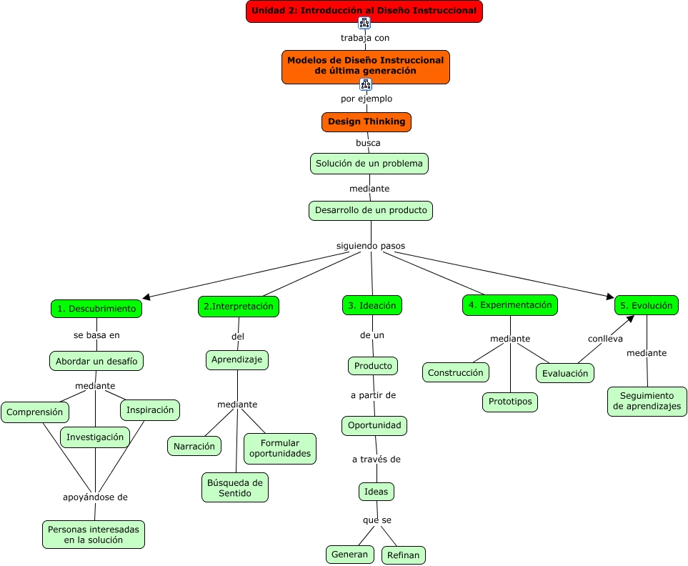 Este Cmap, tiene información relacionada con: 091. Design Thinking, Solución de un problema mediante Desarrollo de un producto, Investigación apoyándose de Personas interesadas en la solución, Abordar un desafío mediante Inspiración, 2.Interpretación del Aprendizaje, Aprendizaje mediante Formular oportunidades, Desarrollo de un producto siguiendo pasos 2.Interpretación, 1. Descubrimiento se basa en Abordar un desafío, Desarrollo de un producto siguiendo pasos 3. Ideación, Modelos de Diseño Instruccional de última generación por ejemplo Design Thinking, Producto a partir de Oportunidad, 4. Experimentación mediante Prototipos, Abordar un desafío mediante Investigación, Evaluación conlleva 5. Evolución, Inspiración apoyándose de Personas interesadas en la solución, Desarrollo de un producto siguiendo pasos 4. Experimentación, Desarrollo de un producto siguiendo pasos 5. Evolución, Ideas que se Refinan, 3. Ideación de un Producto, 4. Experimentación mediante Construcción, Aprendizaje mediante Búsqueda de Sentido