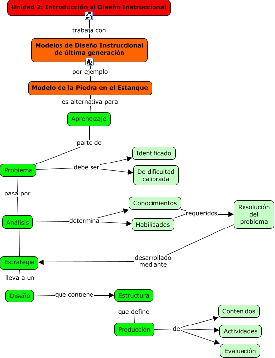 Este Cmap, tiene información relacionada con: 05. Piedra en el estanque, Problema pasa por Análisis, Aprendizaje parte de Problema, Resolución del problema desarrollado mediante Estrategia, Producción de Contenidos, Producción de Evaluación, Análisis determina Habilidades, Modelos de Diseño Instruccional de última generación por ejemplo Modelo de la Piedra en el Estanque, Producción de Actividades, Unidad 2: Introducción al Diseño Instruccional trabaja con Modelos de Diseño Instruccional de última generación, Diseño que contiene Estructura, Análisis ???? Estrategia, Conocimientos requeridos Resolución del problema, Análisis determina Conocimientos, Modelo de la Piedra en el Estanque es alternativa para Aprendizaje, Habilidades requeridos Resolución del problema, Estructura que define Producción, Estrategia lleva a un Diseño, Problema debe ser Identificado, Problema debe ser De dificultad calibrada
