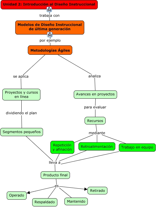 Este Cmap, tiene información relacionada con: 09. Metodologías Ágiles, Modelos de Diseño Instruccional de última generación por ejemplo Metodologías Ágiles, Avances en proyectos para evaluar Recursos, Producto final es Mantenido, Metodologías Ágiles se aplica Proyectos y cursos en línea, Recursos mediante Trabajo en equipo, Metodologías Ágiles analiza Avances en proyectos, Trabajo en equipo lleva a Producto final, Unidad 2: Introducción al Diseño Instruccional trabaja con Modelos de Diseño Instruccional de última generación, Recursos mediante Repetición y afinación, Repetición y afinación lleva a Producto final, Segmentos pequeños lleva a Producto final, Producto final es Operado, Retroalimentación lleva a Producto final, Producto final es Respaldado, Recursos mediante Retroalimentación, Producto final es Retirado, Proyectos y cursos en línea dividiendo el plan Segmentos pequeños
