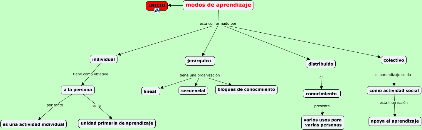 Este Cmap, tiene información relacionada con: modos de aprendizaje, modos de aprendizaje ???? INICIO, a la persona es la unidad primaria de aprendizaje, modos de aprendizaje esta conformado por distribuido, modos de aprendizaje esta conformado por colectivo, individual tiene como objetivo a la persona, jerárquico tiene una organización bloques de conocimiento, como actividad social esta interacción apoya el aprendizaje, modos de aprendizaje esta conformado por individual, jerárquico tiene una organización secuencial, modos de aprendizaje esta conformado por jerárquico, distribuido el conocimiento, a la persona por tanto es una actividad individual, jerárquico tiene una organización lineal, conocimiento presenta varios usos para varias personas, colectivo el aprendizaje se da como actividad social