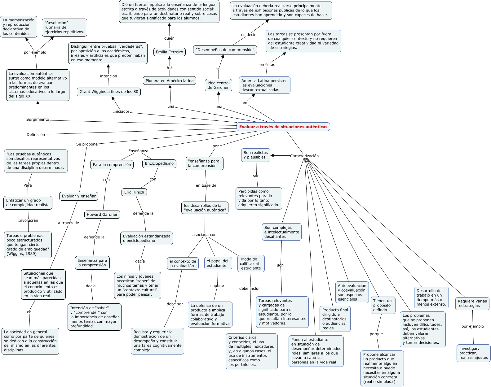 Este Cmap, tiene información relacionada con: Prueba resumen capitulo 3, Situaciones que sean más parecidas a aquellas en las que el conocimiento es producido y utilizado en la vida real en La sociedad en general como por parte de quienes se dedican a la construcción del mismo en las diferentes disciplinas., America Latina persisten las evaluaciones descontextualizadas en éstas Las tareas se presentan por fuera de cualquier contexto y no requieren del estudiante creatividad ni variedad de estrategias., el contexto de la evaluación debe ser Realista y requerir la demostración de un desempeño y constituir una tarea cognitivamente compleja., Evaluación estandarizada o enciclopedismo decía Los niños y jóvenes necesitan "saber" de muchos temas y tener un "contexto cultural" para poder pensar., Enfatizar un grado de complejidad realista Involucran Tareas o problemas poco estructurados que tengan cierto grado de ambigüedad" (Wiggins, 1989), Evaluar a través de situaciones auténticas una idea central de Gardner, el papel del estudiante supone La defensa de un producto e implica formas de trabajo colaborativo y evaluación formativa, Evaluar a través de situaciones auténticas Caracterización Producto final dirigido a destinatarios o audiencias reales, Evaluar a través de situaciones auténticas en America Latina persisten las evaluaciones descontextualizadas, Evaluar a través de situaciones auténticas Se propone Evaluar y enseñar, Son realistas y plausibles son Percibidas como relevantes para la vida por lo tanto, adquieren significado., Evaluar a través de situaciones auténticas por "enseñanza para la comprensión", Modo de calificar al estudiante debe incluir Criterios claros y conocidos, el uso de múltiples indicadores y, en algunos casos, el uso de instrumentos específicos como los portafolios., "Las pruebas auténticas son desafíos representativos de las tareas propias dentro de una disciplina determinada. Para Enfatizar un grado de complejidad realista, Requiere varias estrategias por ejemplo investigar, practicar, realizar ajustes, Evaluar a través de situaciones auténticas Surgimiento La evaluación auténtica surge como modelo alternativo a las formas de evaluar predominantes en los sistemas educativos a lo largo del siglo XX., los desarrollos de la "evaluación auténtica" asociada con el papel del estudiante, Evaluar a través de situaciones auténticas Caracterización Los problemas que se proponen incluyen dificultades, así, los estudiantes deben valorar alternativas y tomar decisiones., Evaluar a través de situaciones auténticas Caracterización Requiere varias estrategias, Para la comprensión con Howard Gardner