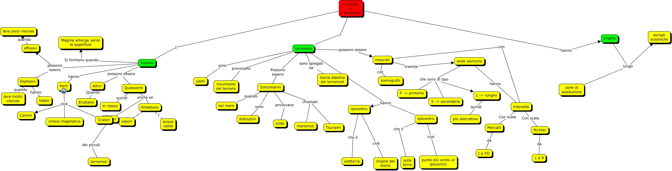 Questa Cmap, creata con IHMC CmapTools, contiene informazioni relative a: I TERREMOTI, Parti cioè Camini, misurati tramite onde sismiche, I vulcani e I terremoti I terremoti, creano dei piccoli terremoti, Esplosivi hanno tappo, Vulcani possono essere Attivi, Quiescenti anche se Emettono, misurati con Intensità, epicentro che è sulla terra, terremoti sono sismi, Intensità Con scala Richter, Parti cioè cmera magmatica, Attivi Quando Eruttano, L -> lunghe quindi più distruttive, Vulcani possono essere Esplosivi, Sottomarini provocano onde, Intensità Con scala Mercalli, terremoti provocano movimenti del terreno, terremoti hanno epicentro, terremoti possono essere misurati
