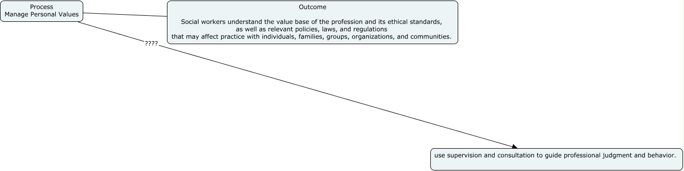 This Concept Map, created with IHMC CmapTools, has information related to: Cmap-EPAS, Process Manage Personal Values ???? Outcome Social workers understand the value base of the profession and its ethical standards, as well as relevant policies, laws, and regulations that may affect practice with individuals, families, groups, organizations, and communities., Process Manage Personal Values ???? use supervision and consultation to guide professional judgment and behavior.