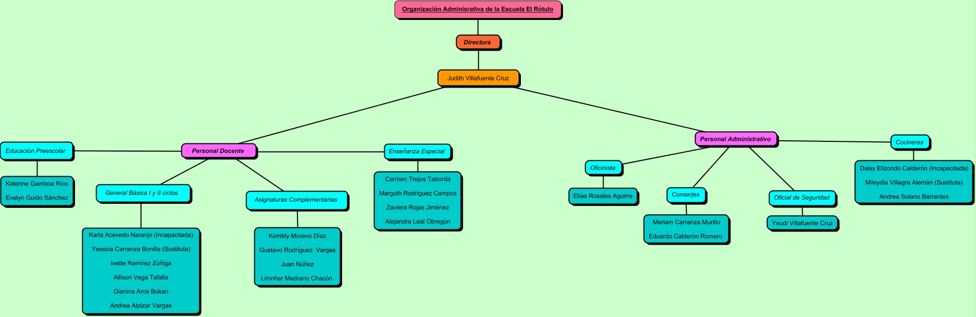 Este Cmap, tiene información relacionada con: Organigrama Práctica Docente, Personal Administrativo ???? Oficial de Seguridad, Conserjes ???? Meriam Carranza Murillo Eduardo Calderón Romero, Personal Docente ???? Educación Preescolar, Educación Preescolar ???? Katerine Gamboa Ríos Evelyn Guido Sánchez, General Básica I y II ciclos ???? Karla Acevedo Naranjo (Incapacitada) Yessica Carranza Bonilla (Sustituta) Ivette Ramírez Zúñiga Allison Vega Tafalla Gianina Arce Bokan Andrea Alpizar Vargas, Personal Administrativo ???? Cocineras, Judith Villafuente Cruz ???? Personal Docente, Asignaturas Complementarias ???? Kembly Moreno Díaz Gustavo Rodríguez Vargas Juan Núñez Limnher Medrano Chacón, Cocineras ???? Daisy Elizondo Calderón (Incapacitada) Mileydia Villagra Alemán (Sustituta) Andrea Solano Barrantes, Personal Docente ???? Asignaturas Complementarias, Personal Administrativo ???? Oficinista, Judith Villafuente Cruz ???? Personal Administrativo, Personal Administrativo ???? Conserjes, Oficial de Seguridad ???? Yeudi Villafuente Cruz, Oficinista ???? Elías Rosales Aguirre, Directora ???? Organización Adminisrativa de la Escuela El Rótulo, Personal Docente ???? Enseñanza Especial, Personal Docente ???? General Básica I y II ciclos, Directora ???? Judith Villafuente Cruz, Enseñanza Especial ???? Carmen Trejos Taborda Margoth Rodríguez Campos Zaviera Rojas Jiménez Alejandra Leal Obregón