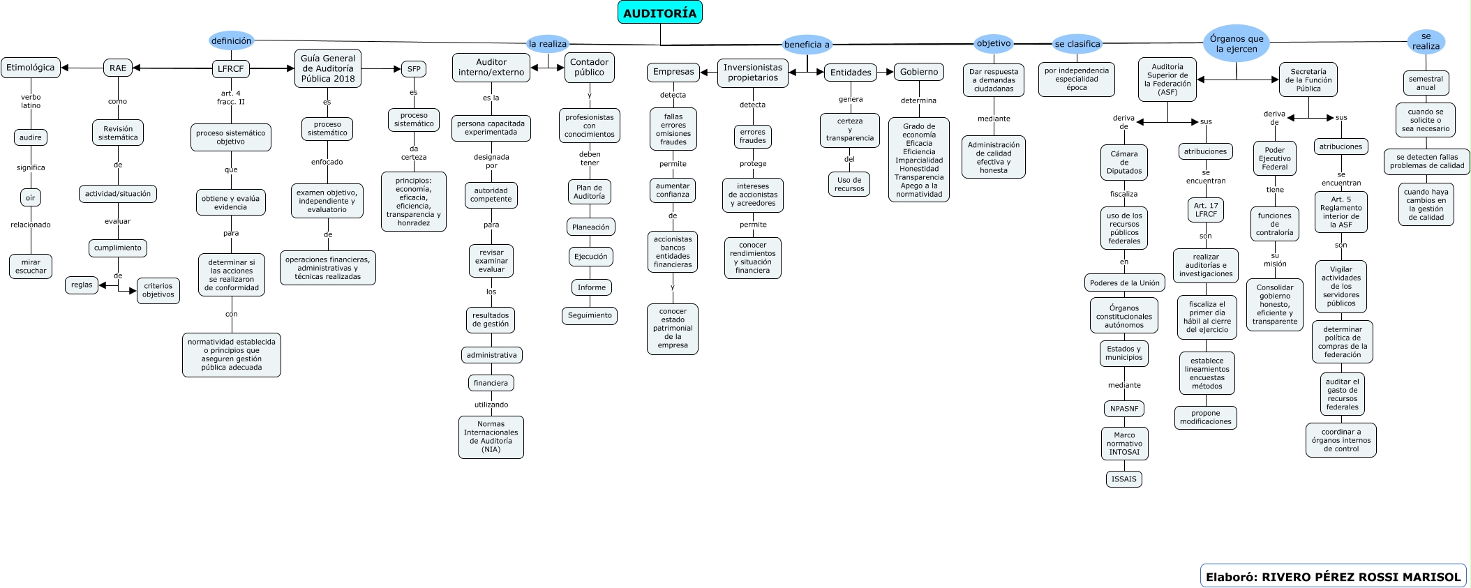 Este Cmap, tiene información relacionada con: Auditoría, LFRCF art. 4 fracc. II proceso sistemático objetivo, proceso sistemático objetivo que obtiene y evalúa evidencia, Art. 5 Reglamento interior de la ASF son coordinar a órganos internos de control, Revisión sistemática de actividad/situación, Secretaría de la Función Pública deriva de Poder Ejecutivo Federal, fallas errores omisiones fraudes permite aumentar confianza, AUDITORÍA beneficia a Entidades, cumplimiento de criterios objetivos, SFP es proceso sistemático, AUDITORÍA se realiza cuando haya cambios en la gestión de calidad, AUDITORÍA beneficia a Inversionistas propietarios, Auditor interno/externo es la persona capacitada experimentada, AUDITORÍA definición Etimológica, Empresas detecta fallas errores omisiones fraudes, Inversionistas propietarios detecta errores fraudes, RAE como Revisión sistemática, certeza y transparencia del Uso de recursos, persona capacitada experimentada designada por autoridad competente, Gobierno determina Grado de economía Eficacia Eficiencia Imparcialidad Honestidad Transparencia Apego a la normatividad, AUDITORÍA definición LFRCF