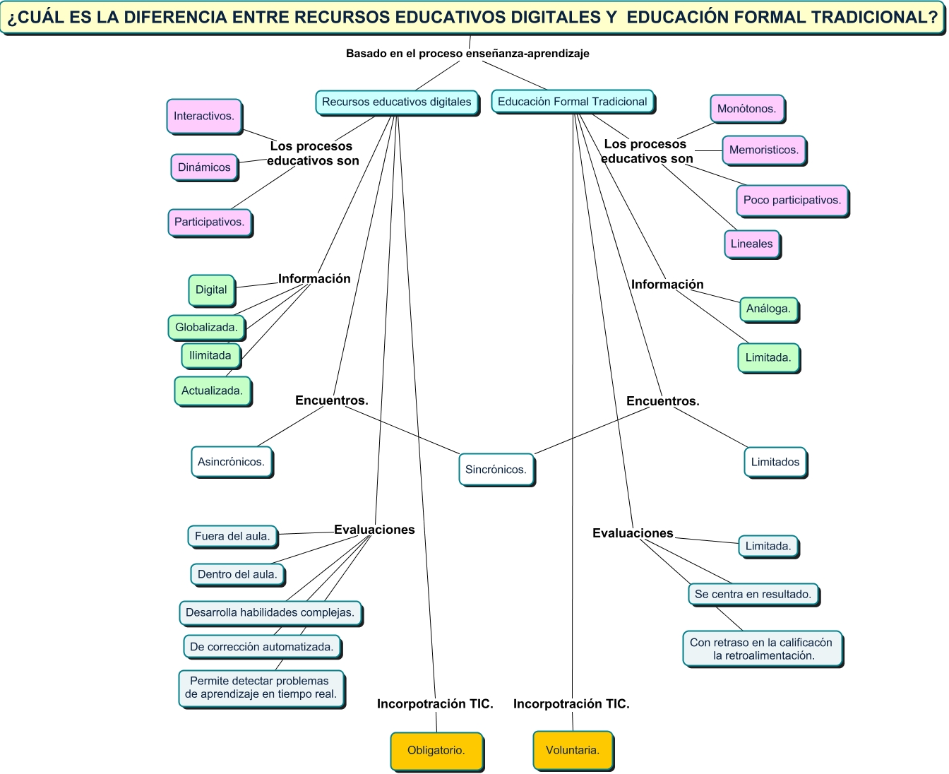 Este Cmap, tiene información relacionada con: DIFERENCIA ENTRE RECURSOS EDUCATIVOS DIGITALES Y EDUCACIÓN FORMAL TRADICIONAL, Recursos educativos digitales Incorpotración TIC. Obligatorio., Educación Formal Tradicional Evaluaciones Se centra en resultado., Recursos educativos digitales Evaluaciones Permite detectar problemas de aprendizaje en tiempo real., Educación Formal Tradicional Información Análoga., Recursos educativos digitales Encuentros. Sincrónicos., Educación Formal Tradicional Los procesos educativos son Memoristicos., ¿CUÁL ES LA DIFERENCIA ENTRE RECURSOS EDUCATIVOS DIGITALES Y EDUCACIÓN FORMAL TRADICIONAL? Basado en el proceso enseñanza-aprendizaje Recursos educativos digitales, Recursos educativos digitales Los procesos educativos son Participativos., Educación Formal Tradicional Los procesos educativos son Lineales, Educación Formal Tradicional Los procesos educativos son Poco participativos., Recursos educativos digitales Información Ilimitada, Educación Formal Tradicional Encuentros. Sincrónicos., Recursos educativos digitales Evaluaciones Desarrolla habilidades complejas., Recursos educativos digitales Evaluaciones Dentro del aula., Educación Formal Tradicional Encuentros. Limitados, Recursos educativos digitales Los procesos educativos son Interactivos., ¿CUÁL ES LA DIFERENCIA ENTRE RECURSOS EDUCATIVOS DIGITALES Y EDUCACIÓN FORMAL TRADICIONAL? Basado en el proceso enseñanza-aprendizaje Educación Formal Tradicional, Recursos educativos digitales Evaluaciones De corrección automatizada., Educación Formal Tradicional Información Limitada., Educación Formal Tradicional Los procesos educativos son Monótonos.