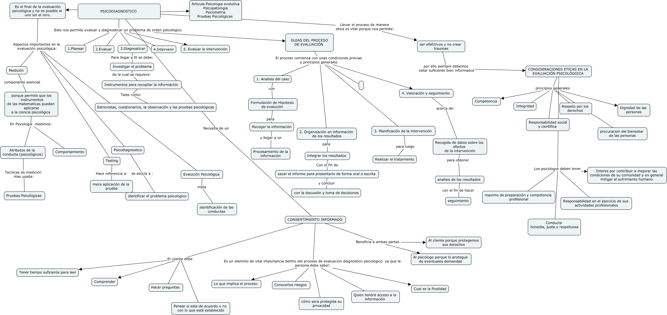 Este Cmap, tiene información relacionada con: Mapa Psicodiagnóstico Clinico I, PSICODIAGNOSTICO ???? Es el final de la evaluación psicológica y no es posible el uno sin el otro., 2. Organización en información de los resultados para Integrar los resultados, analisis de los resultados con el fin de hacer seguimiento, Es el final de la evaluación psicológica y no es posible el uno sin el otro. Aspectos importantes en la evaluación psicológica: Testing, GUIAS DEL PROCESO DE EVALUACIÓN El proceso comienza con unas condiciones previas y principios generales, Atributos de la conducta (psicológicos) Tecnicas de medición mas usada: Pruebas Psicológicas, ser efefctivos y no crear traumas por ello siempre debemos estar suficiente bien informados CONSIDERACIONES ETICAS EN LA EVALUACIÓN PSICOLÓGGICA, Recoger la información y llegar a un Procesamiento de la información, CONSIDERACIONES ETICAS EN LA EVALUACIÓN PSICOLÓGGICA Los psicologos deben tener Responsabilidad en el ejercicio de sus actividades profesionales, Es el final de la evaluación psicológica y no es posible el uno sin el otro. Aspectos importantes en la evaluación psicológica: Evalución Psicológica, GUIAS DEL PROCESO DE EVALUACIÓN El proceso comienza con unas condiciones previas y principios generales 4. Valoración y seguimiento, sacar el informe para presentarlo de forma oral o escrita y concluir con la discusión y toma de decisiones, GUIAS DEL PROCESO DE EVALUACIÓN El proceso comienza con unas condiciones previas y principios generales 1. Analisis del caso, CONSIDERACIONES ETICAS EN LA EVALUACIÓN PSICOLÓGGICA principios generales Integridad, 1. Analisis del caso con Formulación de Hipotesis de evalución, PSICODIAGNOSTICO Este nos permite evaluar y diagnosticar un problema de orden psicológico GUIAS DEL PROCESO DE EVALUACIÓN, 4. Valoración y seguimiento acerca de: Recogida de datos sobre los efectos de la intervención, PSICODIAGNOSTICO Llevar el proceso de manera etica es vital porque nos permite: ser efefctivos y no crear traumas, Psicodiagnostico se asocia a : identificar el problema psicologico, PSICODIAGNOSTICO ???? Articula Psicologia evolutiva Psicopatologia Psicometria Pruebas Psicológicas
