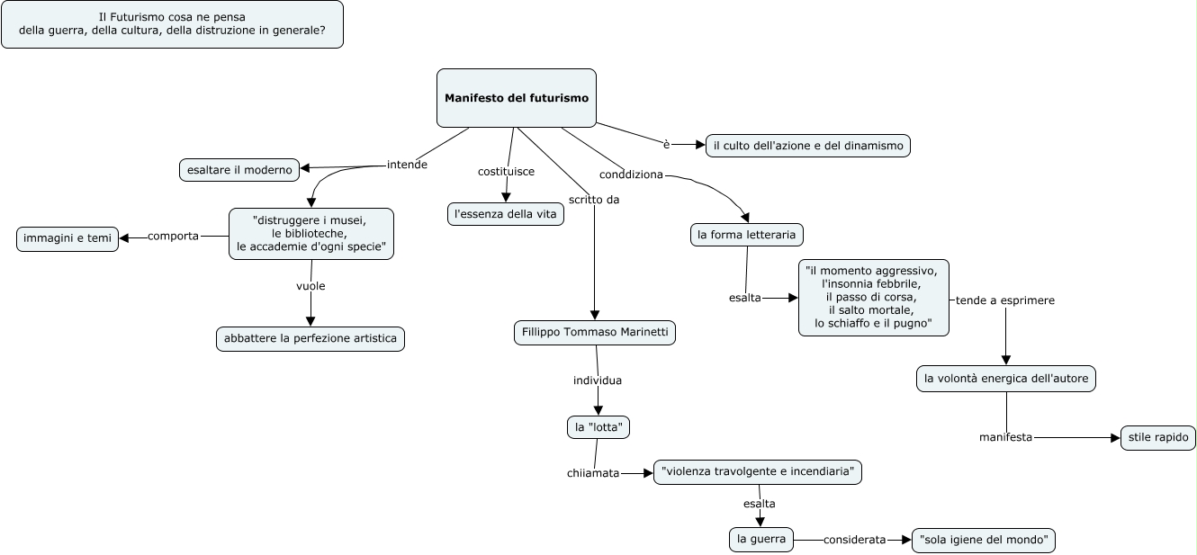 Questa Cmap, creata con IHMC CmapTools, contiene informazioni relative a: futurismo chr, Fillippo Tommaso Marinetti individua la "lotta", la volontà energica dell'autore manifesta stile rapido, Manifesto del futurismo è il culto dell'azione e del dinamismo, "violenza travolgente e incendiaria" esalta la guerra, la guerra considerata "sola igiene del mondo", "distruggere i musei, le biblioteche, le accademie d'ogni specie" vuole abbattere la perfezione artistica, la forma letteraria esalta "il momento aggressivo, l'insonnia febbrile, il passo di corsa, il salto mortale, lo schiaffo e il pugno", "distruggere i musei, le biblioteche, le accademie d'ogni specie" comporta immagini e temi, Manifesto del futurismo intende esaltare il moderno, Manifesto del futurismo costituisce l'essenza della vita, Manifesto del futurismo intende "distruggere i musei, le biblioteche, le accademie d'ogni specie", la "lotta" chiiamata "violenza travolgente e incendiaria", Manifesto del futurismo conddiziona la forma letteraria, Manifesto del futurismo scritto da Fillippo Tommaso Marinetti, "il momento aggressivo, l'insonnia febbrile, il passo di corsa, il salto mortale, lo schiaffo e il pugno" tende a esprimere la volontà energica dell'autore