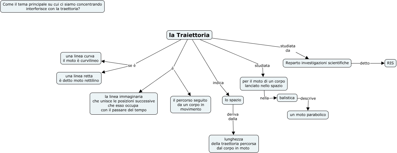 Questa Cmap, creata con IHMC CmapTools, contiene informazioni relative a: la traettoria chri esame, la Traiettoria indica lo spazio, balistica descrive un moto parabolico, la Traiettoria è il percorso seguito da un corpo in movimento, lo spazio deriva dalla lunghezza della traettoria percorsa dal corpo in moto, la Traiettoria se è una linea retta è detto moto rettilino, Reparto investigazioni scientifiche detto RIS, per il moto di un corpo lanciato nello spazio nella balistica, la Traiettoria è la linea immaginaria che unisce le posizioni successive che esso occupa con il passare del tempo, la Traiettoria studiata per il moto di un corpo lanciato nello spazio, la Traiettoria studiata da Reparto investigazioni scientifiche, la Traiettoria se è una linea curva il moto è curvilineo