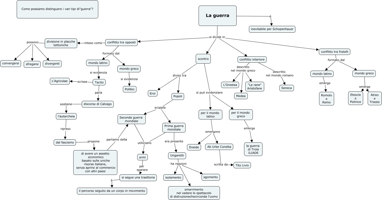 Questa Cmap, creata con IHMC CmapTools, contiene informazioni relative a: la guerra spieg, scontro diviso tra Eroi, l'autarcheia ripreso dal fascismo, conflitto interiore descritto nel mondo romano Seneca, conflitto tra opposti inteso come divisione in placche tettoniche, dal fascismo propone di avere un assetto economico basato sulle uniche risorse italiane, senza aprirsi al commercio con altri paesi, Seconda guerra mondiale utilizzano armi, Ungaretti ha reazioni sgomento, conflitto tra fratelli formato dal mondo greco, mondo greco si evidenzia Polibio, Prima guerra mondiale utilizzano armi, mondo greco emerge Eteocle e Polinice, mondo latino emerge Romolo e Remo, scontro si può evidenziare per il mondo greco, Popoli scoppia Prima guerra mondiale, per il mondo greco emerge la guerra di Troia ILIADE, di avere un assetto economico basato sulle uniche risorse italiane, senza aprirsi al commercio con altri paesi parliamo della Seconda guerra mondiale, Prima guerra mondiale era presente Ungaretti, Ab Urbe Condita scritta da Tito Livio, si segue una traettoria è il percorso seguito da un corpo in movimento, conflitto interiore descritto nel mondo greco "Le rane" Aristofane