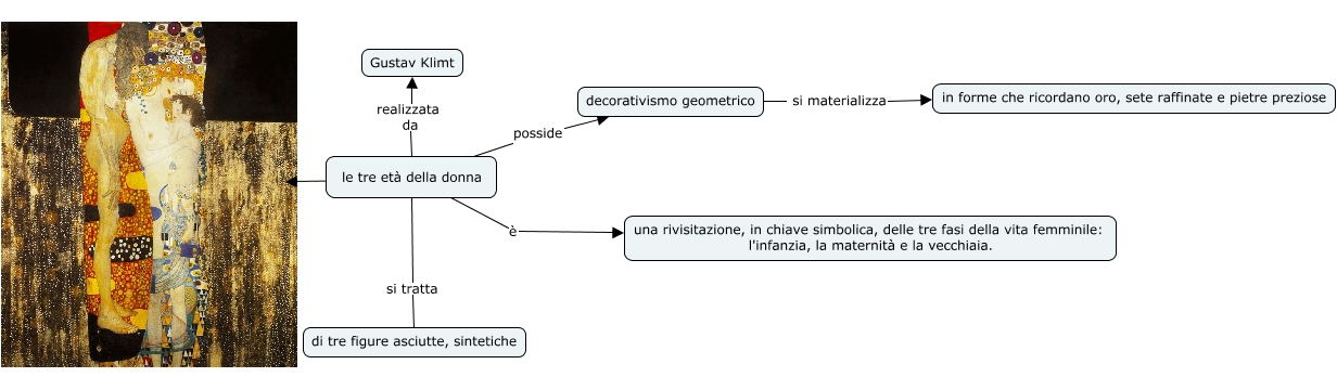 Questa Cmap, creata con IHMC CmapTools, contiene informazioni relative a: Klimt, le tre età della donna realizzata da Gustav Klimt, le tre età della donna si tratta di tre figure asciutte, sintetiche, le tre età della donna è una rivisitazione, in chiave simbolica, delle tre fasi della vita femminile: l'infanzia, la maternità e la vecchiaia., le tre età della donna ????, le tre età della donna posside decorativismo geometrico, decorativismo geometrico si materializza in forme che ricordano oro, sete raffinate e pietre preziose