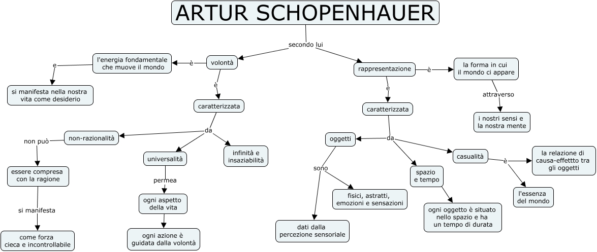 Questa Cmap, creata con IHMC CmapTools, contiene informazioni relative a: Schopenhauer, oggetti sono fisici, astratti, emozioni e sensazioni, caratterizzata da oggetti, essere compresa con la ragione si manifesta come forza cieca e incontrollabile, volontà è caratterizzata, ogni aspetto della vita ???? ogni azione è guidata dalla volontà, rappresentazione è la forma in cui il mondo ci appare, caratterizzata da infinità e insaziabilità, casualità è la relazione di causa-effettto tra gli oggetti, caratterizzata da non-razionalità, ARTUR SCHOPENHAUER secondo lui volontà, spazio e tempo ???? ogni oggetto è situato nello spazio e ha un tempo di durata, caratterizzata da casualità, oggetti sono dati dalla percezione sensoriale, universalità permea ogni aspetto della vita, la forma in cui il mondo ci appare attraverso i nostri sensi e la nostra mente, caratterizzata da spazio e tempo, casualità è l'essenza del mondo, rappresentazione è caratterizzata, ARTUR SCHOPENHAUER secondo lui rappresentazione, non-razionalità non può essere compresa con la ragione