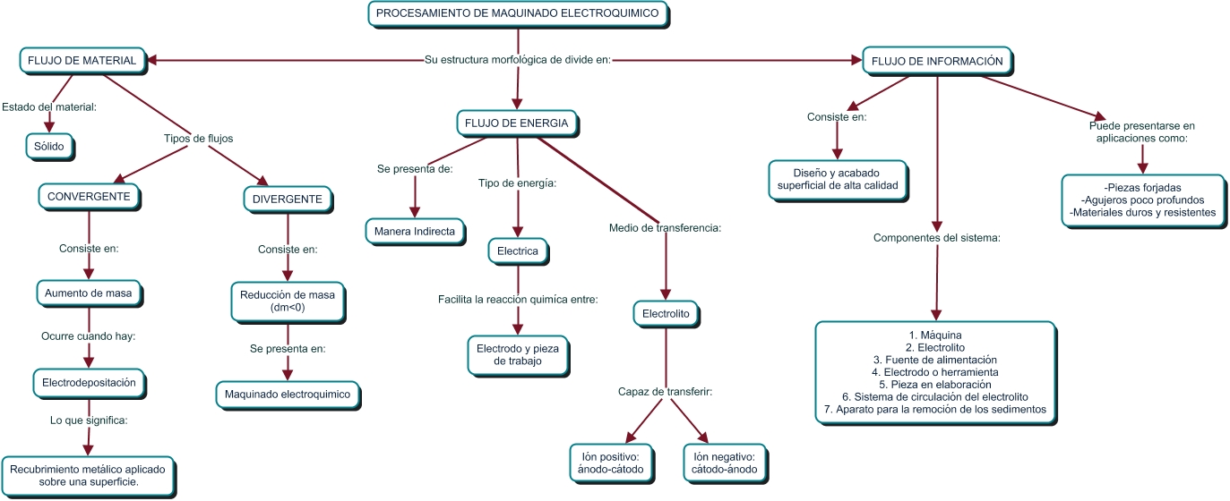 Este Cmap, tiene información relacionada con: Estructura morfologica maquinado electroquimico, PROCESAMIENTO DE MAQUINADO ELECTROQUIMICO Su estructura morfológica de divide en: FLUJO DE MATERIAL, FLUJO DE MATERIAL Tipos de flujos CONVERGENTE, Reducción de masa (dmɘ) Se presenta en: Maquinado electroquimico, Aumento de masa Ocurre cuando hay: Electrodepositación, FLUJO DE MATERIAL Tipos de flujos DIVERGENTE, PROCESAMIENTO DE MAQUINADO ELECTROQUIMICO Su estructura morfológica de divide en: FLUJO DE ENERGIA, Electrica Facilita la reacción quimíca entre: Electrodo y pieza de trabajo, CONVERGENTE Consiste en: Aumento de masa, PROCESAMIENTO DE MAQUINADO ELECTROQUIMICO Su estructura morfológica de divide en: FLUJO DE INFORMACIÓN, FLUJO DE ENERGIA Medio de transferencia: Electrolito, Electrolito Capaz de transferir: Ión positivo: ánodo-cátodo, FLUJO DE ENERGIA Se presenta de: Manera Indirecta, FLUJO DE MATERIAL Estado del material: Sólido, DIVERGENTE Consiste en: Reducción de masa (dmɘ), Electrolito Capaz de transferir: Ión negativo: cátodo-ánodo, Electrodepositación Lo que significa: Recubrimiento metálico aplicado sobre una superficie., FLUJO DE INFORMACIÓN Puede presentarse en aplicaciones como: -Piezas forjadas -Agujeros poco profundos -Materiales duros y resistentes, FLUJO DE ENERGIA Tipo de energía: Electrica, FLUJO DE INFORMACIÓN Componentes del sistema: 1. Máquina 2. Electrolito 3. Fuente de alimentación 4. Electrodo o herramienta 5. Pieza en elaboración 6. Sistema de circulación del electrolito 7. Aparato para la remoción de los sedimentos, FLUJO DE INFORMACIÓN Consiste en: Diseño y acabado superficial de alta calidad