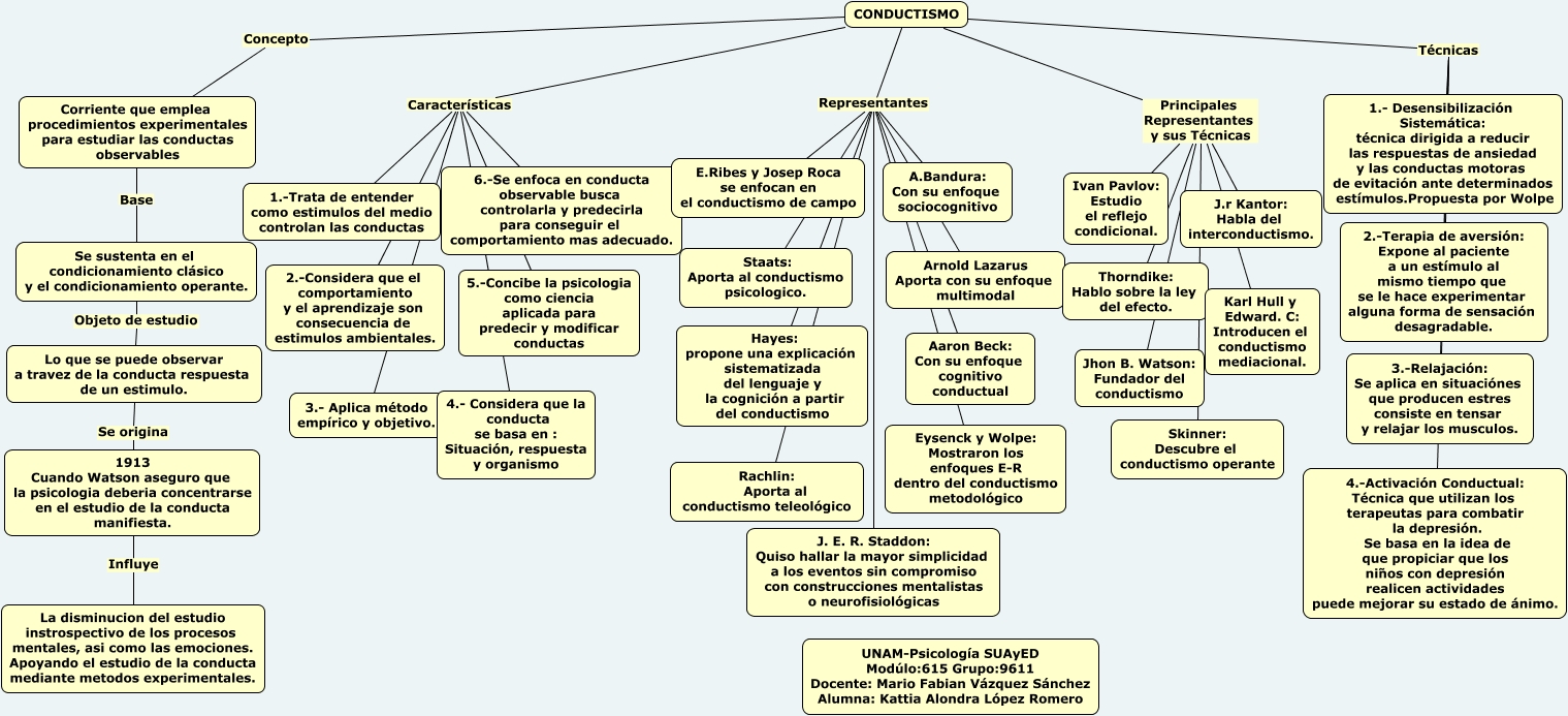 Este Cmap, tiene información relacionada con: CONDUCTISMO, CONDUCTISMO Representantes E.Ribes y Josep Roca se enfocan en el conductismo de campo, CONDUCTISMO Representantes Arnold Lazarus Aporta con su enfoque multimodal, CONDUCTISMO Características 5.-Concibe la psicologia como ciencia aplicada para predecir y modificar conductas, CONDUCTISMO Características 1.-Trata de entender como estimulos del medio controlan las conductas, CONDUCTISMO Principales Representantes y sus Técnicas Ivan Pavlov: Estudio el reflejo condicional., CONDUCTISMO Características 3.- Aplica método empírico y objetivo., CONDUCTISMO Características 4.- Considera que la conducta se basa en : Situación, respuesta y organismo, CONDUCTISMO Concepto Corriente que emplea procedimientos experimentales para estudiar las conductas observables, 1913 Cuando Watson aseguro que la psicologia deberia concentrarse en el estudio de la conducta manifiesta. Influye La disminucion del estudio instrospectivo de los procesos mentales, asi como las emociones. Apoyando el estudio de la conducta mediante metodos experimentales., CONDUCTISMO Representantes Rachlin: Aporta al conductismo teleológico, CONDUCTISMO Representantes Staats: Aporta al conductismo psicologico., CONDUCTISMO Representantes J. E. R. Staddon: Quiso hallar la mayor simplicidad a los eventos sin compromiso con construcciones mentalistas o neurofisiológicas, Corriente que emplea procedimientos experimentales para estudiar las conductas observables Base Se sustenta en el condicionamiento clásico y el condicionamiento operante., CONDUCTISMO Técnicas 3.-Relajación: Se aplica en situaciónes que producen estres consiste en tensar y relajar los musculos., CONDUCTISMO Principales Representantes y sus Técnicas Thorndike: Hablo sobre la ley del efecto., CONDUCTISMO Representantes Hayes: propone una explicación sistematizada del lenguaje y la cognición a partir del conductismo, CONDUCTISMO Características 6.-Se enfoca en conducta observable busca controlarla y predecirla para conseguir el comportamiento mas adecuado., Se sustenta en el condicionamiento clásico y el condicionamiento operante. Objeto de estudio Lo que se puede observar a travez de la conducta respuesta de un estimulo., CONDUCTISMO Características 2.-Considera que el comportamiento y el aprendizaje son consecuencia de estimulos ambientales., CONDUCTISMO Representantes A.Bandura: Con su enfoque sociocognitivo