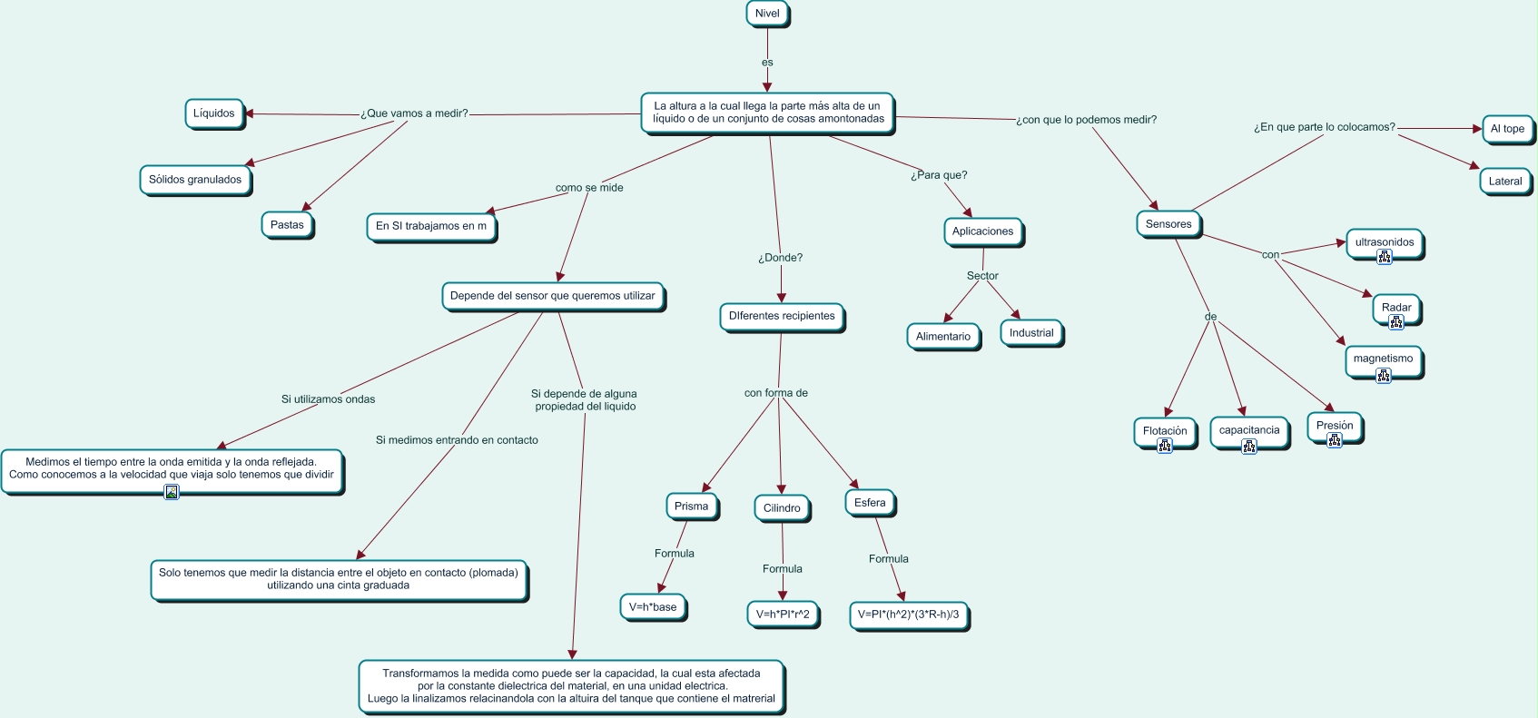 Este Cmap, tiene información relacionada con: 1 Mapa conceptual nivel, Cilindro Formula V=h*PI*r^2, Sensores con ultrasonidos, Sensores de capacitancia, La altura a la cual llega la parte más alta de un líquido o de un conjunto de cosas amontonadas ¿Que vamos a medir? Pastas, Depende del sensor que queremos utilizar Si depende de alguna propiedad del liquido Transformamos la medida como puede ser la capacidad, la cual esta afectada por la constante dielectrica del material, en una unidad electrica. Luego la linalizamos relacinandola con la altuira del tanque que contiene el matrerial, Nivel es La altura a la cual llega la parte más alta de un líquido o de un conjunto de cosas amontonadas, La altura a la cual llega la parte más alta de un líquido o de un conjunto de cosas amontonadas como se mide Depende del sensor que queremos utilizar, La altura a la cual llega la parte más alta de un líquido o de un conjunto de cosas amontonadas ¿Para que? Aplicaciones, Aplicaciones Sector Industrial, Sensores ¿En que parte lo colocamos? Lateral, La altura a la cual llega la parte más alta de un líquido o de un conjunto de cosas amontonadas como se mide En SI trabajamos en m, Depende del sensor que queremos utilizar Si medimos entrando en contacto Solo tenemos que medir la distancia entre el objeto en contacto (plomada) utilizando una cinta graduada, Sensores de Flotación, La altura a la cual llega la parte más alta de un líquido o de un conjunto de cosas amontonadas ¿Donde? DIferentes recipientes, Sensores ¿En que parte lo colocamos? Al tope, Depende del sensor que queremos utilizar Si utilizamos ondas Medimos el tiempo entre la onda emitida y la onda reflejada. Como conocemos a la velocidad que viaja solo tenemos que dividir, Esfera Formula V=PI*(h^2)*(3*R-h)/3, Sensores con Radar, La altura a la cual llega la parte más alta de un líquido o de un conjunto de cosas amontonadas ¿Que vamos a medir? Líquidos, DIferentes recipientes con forma de Esfera