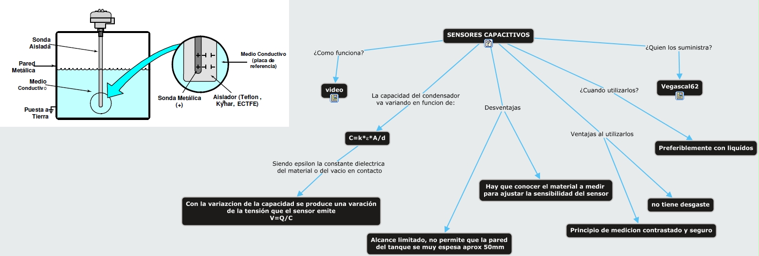 Este Cmap, tiene información relacionada con: 2 mapa capacidad, SENSORES CAPACITIVOS Desventajas Alcance limitado, no permite que la pared del tanque se muy espesa aprox 50mm, C=k*ε*A/d Siendo epsilon la constante dielectrica del material o del vacio en contacto Con la variazcion de la capacidad se produce una varación de la tensión que el sensor emite V=Q/C, SENSORES CAPACITIVOS ¿Quien los suministra? Vegascal62, SENSORES CAPACITIVOS Ventajas al utilizarlos Principio de medicion contrastado y seguro, SENSORES CAPACITIVOS ¿Cuando utilizarlos? Preferiblemente con liquídos, SENSORES CAPACITIVOS Ventajas al utilizarlos no tiene desgaste, SENSORES CAPACITIVOS ¿Como funciona? video, SENSORES CAPACITIVOS Desventajas Hay que conocer el material a medir para ajustar la sensibilidad del sensor, SENSORES CAPACITIVOS La capacidad del condensador va variando en funcion de: C=k*ε*A/d