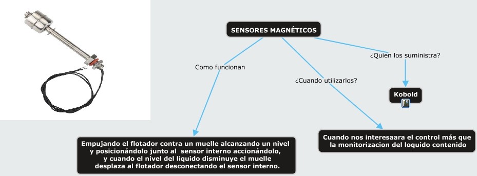 Este Cmap, tiene información relacionada con: 2 Mapa magnéticos, SENSORES MAGNÉTICOS ¿Quien los suministra? Kobold, SENSORES MAGNÉTICOS ¿Cuando utilizarlos? Cuando nos interesaara el control más que la monitorizacion del loquido contenido, SENSORES MAGNÉTICOS Como funcionan Empujando el flotador contra un muelle alcanzando un nivel y posicionándolo junto al sensor interno accionándolo, y cuando el nivel del liquido disminuye el muelle desplaza al flotador desconectando el sensor interno.