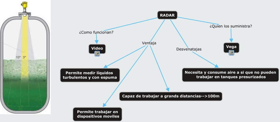 Este Cmap, tiene información relacionada con: 2 Mapa radar, RADAR ¿Como funcionan? Video, RADAR Desvenatajas Necesita y consume aire a si que no pueden trabajar en tanques presurizados, RADAR Ventaja Capaz de trabajar a grands distancias--m, RADAR Ventaja Permite medir líquidos turbulentos y con espuma, RADAR Ventaja Permite trabajar en dispositivos moviles, RADAR ¿Quien los suministra? Vega