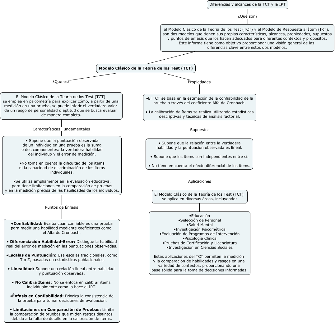 Este Cmap, tiene información relacionada con: Diferencia entre los modelos TCT E IRT, El Modelo Clásico de la Teoría de los Test (TCT) se aplica en diversas áreas, incluyendo: ???? •Educación •Selección de Personal •Salud Mental •Investigación Psicométrica •Evaluación de Programas de Intervención •Psicología Clínica •Pruebas de Certificación y Licenciatura •Investigación en Ciencias Sociales Estas aplicaciones del TCT permiten la medición y la comparación de habilidades y rasgos en una variedad de contextos, proporcionando una base sólida para la toma de decisiones informadas., El Modelo Clásico de la Teoría de los Test (TCT) se emplea en psicometría para explicar cómo, a partir de una medición en una prueba, se puede inferir el verdadero valor de un rasgo de personalidad o aptitud que se busca evaluar de manera completa. Características Fundamentales • Supone que la puntuación observada de un individuo en una prueba es la suma e dos componentes: la verdadera habilidad del individuo y el error de medición. •No toma en cuenta la dificultad de los ítems ni la capacidad de discriminación de los ítems individuales. •Se utiliza ampliamente en la evaluación educativa, pero tiene limitaciones en la comparación de pruebas y en la medición precisa de las habilidades de los individuos., •El TCT se basa en la estimación de la confiabilidad de la prueba a través del coeficiente Alfa de Cronbach. • La calibración de ítems se realiza utilizando estadísticas descriptivas y técnicas de análisis factorial. Supuestos • Supone que la relación entre la verdadera habilidad y la puntuación observada es lineal. • Supone que los ítems son independientes entre sí. • No tiene en cuenta el efecto diferencial de los ítems., Diferencias y alcances de la TCT y la IRT ¿Qué son? el Modelo Clásico de la Teoría de los Test (TCT) y el Modelo de Respuesta al Ítem (IRT). son dos modelos que tienen sus propias características, alcances, propiedades, supuestos y puntos de énfasis que los hacen adecuados para diferentes contextos y propósitos. Este informe tiene como objetivo proporcionar una visión general de las diferencias clave entre estos dos modelos., Modelo Clásico de la Teoría de los Test (TCT) Propiedades •El TCT se basa en la estimación de la confiabilidad de la prueba a través del coeficiente Alfa de Cronbach. • La calibración de ítems se realiza utilizando estadísticas descriptivas y técnicas de análisis factorial., Modelo Clásico de la Teoría de los Test (TCT) ¿Qué es? El Modelo Clásico de la Teoría de los Test (TCT) se emplea en psicometría para explicar cómo, a partir de una medición en una prueba, se puede inferir el verdadero valor de un rasgo de personalidad o aptitud que se busca evaluar de manera completa., el Modelo Clásico de la Teoría de los Test (TCT) y el Modelo de Respuesta al Ítem (IRT). son dos modelos que tienen sus propias características, alcances, propiedades, supuestos y puntos de énfasis que los hacen adecuados para diferentes contextos y propósitos. Este informe tiene como objetivo proporcionar una visión general de las diferencias clave entre estos dos modelos. ???? Modelo Clásico de la Teoría de los Test (TCT), • Supone que la puntuación observada de un individuo en una prueba es la suma e dos componentes: la verdadera habilidad del individuo y el error de medición. •No toma en cuenta la dificultad de los ítems ni la capacidad de discriminación de los ítems individuales. •Se utiliza ampliamente en la evaluación educativa, pero tiene limitaciones en la comparación de pruebas y en la medición precisa de las habilidades de los individuos. Puntos de Énfasis •Confiabilidad: Evalúa cuán confiable es una prueba para medir una habilidad mediante coeficientes como el Alfa de Cronbach. • Diferenciación Habilidad-Error: Distingue la habilidad real del error de medición en las puntuaciones observadas. •Escalas de Puntuación: Usa escalas tradicionales, como T o Z, basadas en estadísticas poblacionales. • Linealidad: Supone una relación lineal entre habilidad y puntuación observada. • No Calibra Ítems: No se enfoca en calibrar ítems individualmente como lo hace el IRT. •Énfasis en Confiabilidad: Prioriza la consistencia de la prueba para tomar decisiones de evaluación. • Limitaciones en Comparación de Pruebas: Limita la comparación de pruebas que miden rasgos distintos debido a la falta de detalle en la calibración de ítems., • Supone que la relación entre la verdadera habilidad y la puntuación observada es lineal. • Supone que los ítems son independientes entre sí. • No tiene en cuenta el efecto diferencial de los ítems. Aplicaciones El Modelo Clásico de la Teoría de los Test (TCT) se aplica en diversas áreas, incluyendo: