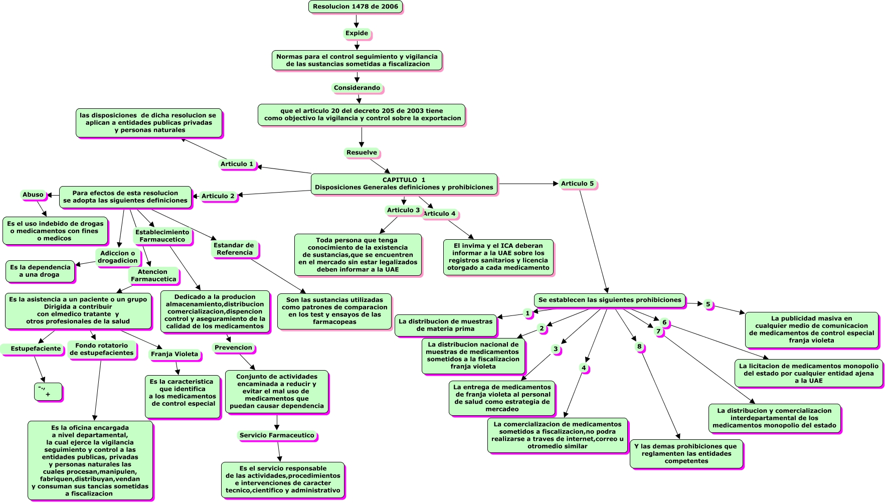 Este Cmap, tiene información relacionada con: Resolucion 1478 de 2006, CAPITULO 1 Disposiciones Generales definiciones y prohibiciones Articulo 4 El invima y el ICA deberan informar a la UAE sobre los registros sanitarios y licencia otorgado a cada medicamento, Para efectos de esta resolucion se adopta las siguientes definiciones Establecimiento Farmaucetico Dedicado a la producion almacenamiento,distribucion comercializacion,dispencion control y aseguramiento de la calidad de los medicamentos, Conjunto de actividades encaminada a reducir y evitar el mal uso de medicamentos que puedan causar dependencia Servicio Farmaceutico Es el servicio responsable de las actividades,procedimientos e intervenciones de caracter tecnico,cientifico y administrativo, Es la asistencia a un paciente o un grupo Dirigida a contribuir con elmedico tratante y otros profesionales de la salud Estupefaciente -., +, CAPITULO 1 Disposiciones Generales definiciones y prohibiciones Articulo 3 Toda persona que tenga conocimiento de la existencia de sustancias,que se encuentren en el mercado sin estar legalizados deben informar a la UAE, CAPITULO 1 Disposiciones Generales definiciones y prohibiciones Articulo 1 las disposiciones de dicha resolucion se aplican a entidades publicas privadas y personas naturales, Dedicado a la producion almacenamiento,distribucion comercializacion,dispencion control y aseguramiento de la calidad de los medicamentos Prevencion Conjunto de actividades encaminada a reducir y evitar el mal uso de medicamentos que puedan causar dependencia, Para efectos de esta resolucion se adopta las siguientes definiciones Abuso Es el uso indebido de drogas o medicamentos con fines o medicos, Se establecen las siguientes prohibiciones 8 Y las demas prohibiciones que reglamenten las entidades competentes, Para efectos de esta resolucion se adopta las siguientes definiciones Adiccion o drogadicion Es la dependencia a una droga, Se establecen las siguientes prohibiciones 6 La licitacion de medicamentos monopolio del estado por cualquier entidad ajena a la UAE, CAPITULO 1 Disposiciones Generales definiciones y prohibiciones Articulo 5 Se establecen las siguientes prohibiciones, CAPITULO 1 Disposiciones Generales definiciones y prohibiciones Articulo 2 Para efectos de esta resolucion se adopta las siguientes definiciones, Es la asistencia a un paciente o un grupo Dirigida a contribuir con elmedico tratante y otros profesionales de la salud Franja Violeta Es la caracteristica que identifica a los medicamentos de control especial, Se establecen las siguientes prohibiciones 4 La comercializacion de medicamentos sometidos a fiscalizacion,no podra realizarse a traves de internet,correo u otromedio similar, Es la asistencia a un paciente o un grupo Dirigida a contribuir con elmedico tratante y otros profesionales de la salud Fondo rotatorio de estupefacientes Es la oficina encargada a nivel departamental, la cual ejerce la vigilancia seguimiento y control a las entidades publicas, privadas y personas naturales las cuales procesan,manipulen, fabriquen,distribuyan,vendan y consuman sus tancias sometidas a fiscalizacion, Para efectos de esta resolucion se adopta las siguientes definiciones Estandar de Referencia Son las sustancias utilizadas como patrones de comparacion en los test y ensayos de las farmacopeas, Se establecen las siguientes prohibiciones 2 La distribucion nacional de muestras de medicamentos sometidos a la fiscalizacion franja violeta, Se establecen las siguientes prohibiciones 1 La distribucion de muestras de materia prima, Normas para el control seguimiento y vigilancia de las sustancias sometidas a fiscalizacion Considerando que el articulo 20 del decreto 205 de 2003 tiene como objectivo la vigilancia y control sobre la exportacion