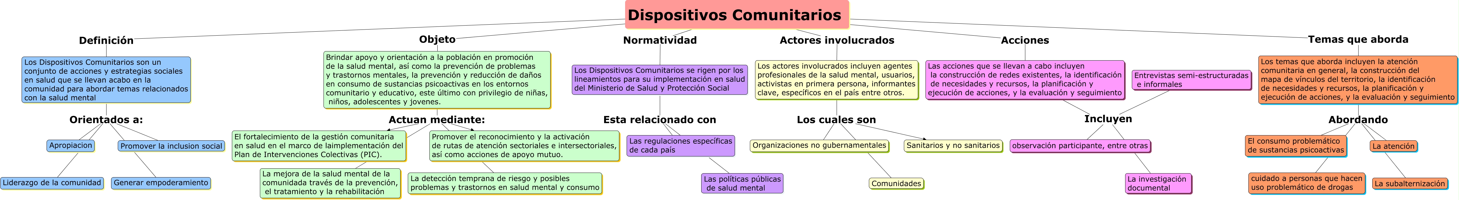 Este Cmap, tiene información relacionada con: Dispositivos Comunitarios, Dispositivos Comunitarios Acciones Las acciones que se llevan a cabo incluyen la construcción de redes existentes, la identificación de necesidades y recursos, la planificación y ejecución de acciones, y la evaluación y seguimiento, Los actores involucrados incluyen agentes profesionales de la salud mental, usuarios, activistas en primera persona, informantes clave, específicos en el país entre otros. Los cuales son Sanitarios y no sanitarios, Brindar apoyo y orientación a la población en promoción de la salud mental, así como la prevención de problemas y trastornos mentales, la prevención y reducción de daños en consumo de sustancias psicoactivas en los entornos comunitario y educativo, este último con privilegio de niñas, niños, adolescentes y jovenes. Actuan mediante: La detección temprana de riesgo y posibles problemas y trastornos en salud mental y consumo, Brindar apoyo y orientación a la población en promoción de la salud mental, así como la prevención de problemas y trastornos mentales, la prevención y reducción de daños en consumo de sustancias psicoactivas en los entornos comunitario y educativo, este último con privilegio de niñas, niños, adolescentes y jovenes. Actuan mediante: El fortalecimiento de la gestión comunitaria en salud en el marco de laimplementación del Plan de Intervenciones Colectivas (PIC)., Los Dispositivos Comunitarios se rigen por los lineamientos para su implementación en salud del Ministerio de Salud y Protección Social Esta relacionado con Las políticas públicas de salud mental, Brindar apoyo y orientación a la población en promoción de la salud mental, así como la prevención de problemas y trastornos mentales, la prevención y reducción de daños en consumo de sustancias psicoactivas en los entornos comunitario y educativo, este último con privilegio de niñas, niños, adolescentes y jovenes. Actuan mediante: La mejora de la salud mental de la comunidada través de la prevención, el tratamiento y la rehabilitación, Los temas que aborda incluyen la atención comunitaria en general, la construcción del mapa de vínculos del territorio, la identificación de necesidades y recursos, la planificación y ejecución de acciones, y la evaluación y seguimiento Abordando cuidado a personas que hacen uso problemático de drogas, Los Dispositivos Comunitarios son un conjunto de acciones y estrategias sociales en salud que se llevan acabo en la comunidad para abordar temas relacionados con la salud mental Orientados a: Apropiacion, Los temas que aborda incluyen la atención comunitaria en general, la construcción del mapa de vínculos del territorio, la identificación de necesidades y recursos, la planificación y ejecución de acciones, y la evaluación y seguimiento Abordando El consumo problemático de sustancias psicoactivas, Dispositivos Comunitarios Definición Los Dispositivos Comunitarios son un conjunto de acciones y estrategias sociales en salud que se llevan acabo en la comunidad para abordar temas relacionados con la salud mental, Entrevistas semi-estructuradas e informales Incluyen observación participante, entre otras, Los Dispositivos Comunitarios son un conjunto de acciones y estrategias sociales en salud que se llevan acabo en la comunidad para abordar temas relacionados con la salud mental Orientados a: Promover la inclusion social, Los Dispositivos Comunitarios son un conjunto de acciones y estrategias sociales en salud que se llevan acabo en la comunidad para abordar temas relacionados con la salud mental Orientados a: Liderazgo de la comunidad, Los actores involucrados incluyen agentes profesionales de la salud mental, usuarios, activistas en primera persona, informantes clave, específicos en el país entre otros. Los cuales son Organizaciones no gubernamentales, Los actores involucrados incluyen agentes profesionales de la salud mental, usuarios, activistas en primera persona, informantes clave, específicos en el país entre otros. Los cuales son Comunidades, Los Dispositivos Comunitarios son un conjunto de acciones y estrategias sociales en salud que se llevan acabo en la comunidad para abordar temas relacionados con la salud mental Orientados a: Generar empoderamiento, Las acciones que se llevan a cabo incluyen la construcción de redes existentes, la identificación de necesidades y recursos, la planificación y ejecución de acciones, y la evaluación y seguimiento Incluyen observación participante, entre otras, Los temas que aborda incluyen la atención comunitaria en general, la construcción del mapa de vínculos del territorio, la identificación de necesidades y recursos, la planificación y ejecución de acciones, y la evaluación y seguimiento Abordando La atención, Dispositivos Comunitarios Normatividad Los Dispositivos Comunitarios se rigen por los lineamientos para su implementación en salud del Ministerio de Salud y Protección Social, Dispositivos Comunitarios Objeto Brindar apoyo y orientación a la población en promoción de la salud mental, así como la prevención de problemas y trastornos mentales, la prevención y reducción de daños en consumo de sustancias psicoactivas en los entornos comunitario y educativo, este último con privilegio de niñas, niños, adolescentes y jovenes.