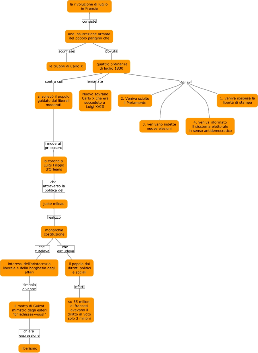 Questa Cmap, creata con IHMC CmapTools, contiene informazioni relative a: La rivoluzione di luglio 1830, quattro ordinanze di luglio 1830 con cui 3. venivano indette nuove elezioni, il popolo dai ditritti politici e sociali infatti su 35 milioni di francesi avevano il diritto al voto solo 3 milioni, la corona a Luigi Filippo d'Orléans che attraverso la politica del juste mileau, quattro ordinanze di luglio 1830 emanate Nuovo sovrano Carlo X che era succeduto a Luigi XVIII, si sollevò il popolo guidato dai liberali moderati i moderati proposero la corona a Luigi Filippo d'Orléans, una insurrezione armata del popolo parigino che sconfisse le truppe di Carlo X, quattro ordinanze di luglio 1830 con cui 1. veniva sospesa la libertà di stampa, il motto di Guizot mimstro degli esteri "Enrichissez-vous!" chiara espressione liberismo, la rivoluzione di luglio in Francia consistè una insurrezione armata del popolo parigino che, monarchia costituzione che tutelava interessi dell'aristocrazia liberale e della borghesia degli affari, quattro ordinanze di luglio 1830 contro cui si sollevò il popolo guidato dai liberali moderati, juste mileau realizzò monarchia costituzione, quattro ordinanze di luglio 1830 con cui 4. veniva riformato il sisstema elettorale in senso antidemocratico, quattro ordinanze di luglio 1830 con cui 2. Veniva sciolto il Parlamento, interessi dell'aristocrazia liberale e della borghesia degli affari simbolo divenne il motto di Guizot mimstro degli esteri "Enrichissez-vous!", una insurrezione armata del popolo parigino che dovuta quattro ordinanze di luglio 1830, monarchia costituzione che escludeva il popolo dai ditritti politici e sociali