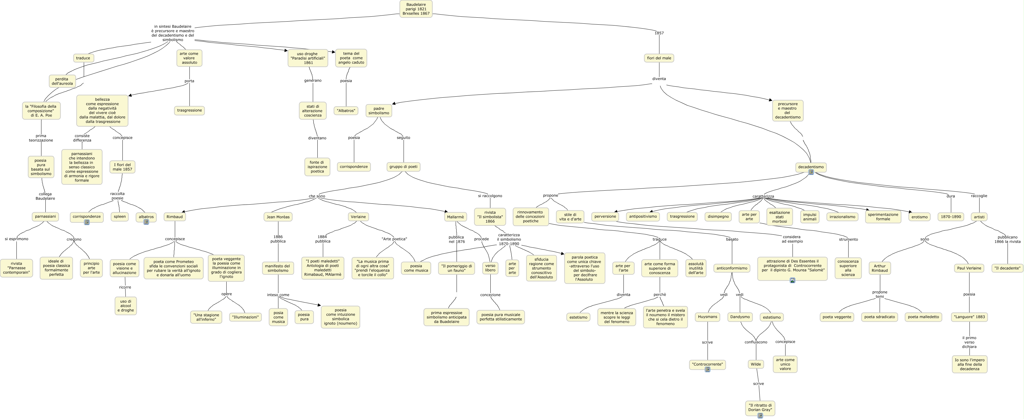 Questa Cmap, creata con IHMC CmapTools, contiene informazioni relative a: Decadentismo V C ferrarin, arte come forma superiore di conoscenza perchè mentre la scienza scopre le leggi del fenomeno, decadentismo dura 1870-1890, decadentismo propone rinnovamento delle concezioni poetiche, Jean Morèas 1886 pubblica manifesto del simbolismo, I fiori del male 1857 raccolta poesie spleen, Baudelaire parigi 1821 Brxselles 1867 in sintesi Baudelaire è precursore e maestro del decadentismo e del simbolismo la "Filosofia della composizione" di E. A. Poe, Baudelaire parigi 1821 Brxselles 1867 in sintesi Baudelaire è precursore e maestro del decadentismo e del simbolismo traduce, gruppo di poeti si raccolgono rivista "Il simbolista" 1866, poesia come visione e allucinazione ricorre uso di alcool e droghe, "Languore" 1883 il primo verso dichiara Io sono l'impero alla fine della decadenza, Arthur Rimbaud propone temi poeta sdradicato, Dandysmo confluiscono Wilde, padre simbolismo poesia corrispondenze, estetismo confluiscono Wilde, Baudelaire parigi 1821 Brxselles 1867 in sintesi Baudelaire è precursore e maestro del decadentismo e del simbolismo tema del poeta come angelo caduto, poeta veggente la poesia come illuminazione in grado di cogliera l'ignoto opere "Una stagione all'inferno", rivista "Il simbolista" 1866 caratterizza il simbolismo 1870-1890 parola poetica come unica chiave -attraverso l'uso del simbolo- per decifrare l'Assoluto, fiori del male diventa precursore e maestro del decadentismo, decadentismo raccoglie artisti, rivista "Il simbolista" 1866 caratterizza il simbolismo 1870-1890 sfiducia ragione come strumento conoscitivo dell'Assoluto