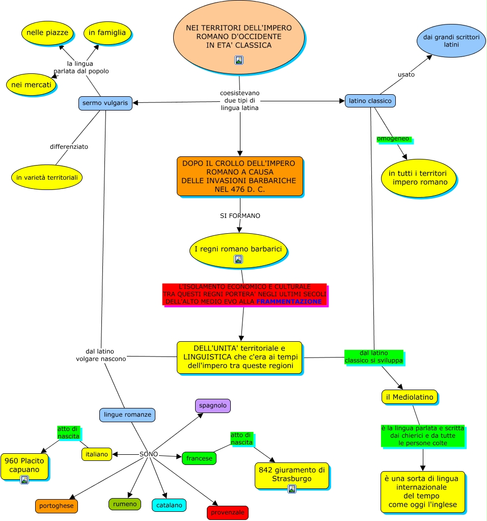 Questa Cmap, creata con IHMC CmapTools, contiene informazioni relative a: LINGUE LATINE terza effe, sermo vulgaris la lingua parlata dal popolo nelle piazze, lingue romanze SONO rumeno, latino classico dal latino classico si sviluppa il Mediolatino, NEI TERRITORI DELL'IMPERO ROMANO D'OCCIDENTE IN ETA' CLASSICA coesistevano due tipi di lingua latina DOPO IL CROLLO DELL'IMPERO ROMANO A CAUSA DELLE INVASIONI BARBARICHE NEL 476 D. C., sermo vulgaris differenziato in varietà territoriali, lingue romanze SONO francese, sermo vulgaris la lingua parlata dal popolo in famiglia, NEI TERRITORI DELL'IMPERO ROMANO D'OCCIDENTE IN ETA' CLASSICA coesistevano due tipi di lingua latina sermo vulgaris, lingue romanze SONO catalano, sermo vulgaris la lingua parlata dal popolo nei mercati, latino classico omogeneo in tutti i territori impero romano, francese atto di nascita 842 giuramento di Strasburgo, I regni romano barbarici L'ISOLAMENTO ECONOMICO E CULTURALE TRA QUESTI REGNI PORTERA' NEGLI ULTIMI SECOLI DELL'ALTO MEDIO EVO ALLA FRAMMENTAZIONE DELL'UNITA' territoriale e LINGUISTICA che c'era ai tempi dell'impero tra queste regioni, latino classico usato dai grandi scrittori latini, lingue romanze SONO spagnolo, DOPO IL CROLLO DELL'IMPERO ROMANO A CAUSA DELLE INVASIONI BARBARICHE NEL 476 D. C. SI FORMANO I regni romano barbarici, il Mediolatino è la lingua parlata e scritta dai chierici e da tutte le persone colte è una sorta di lingua internazionale del tempo come oggi l'inglese, italiano atto di nascita 960 Placito capuano, DELL'UNITA' territoriale e LINGUISTICA che c'era ai tempi dell'impero tra queste regioni dal latino volgare nascono lingue romanze, lingue romanze SONO italiano
