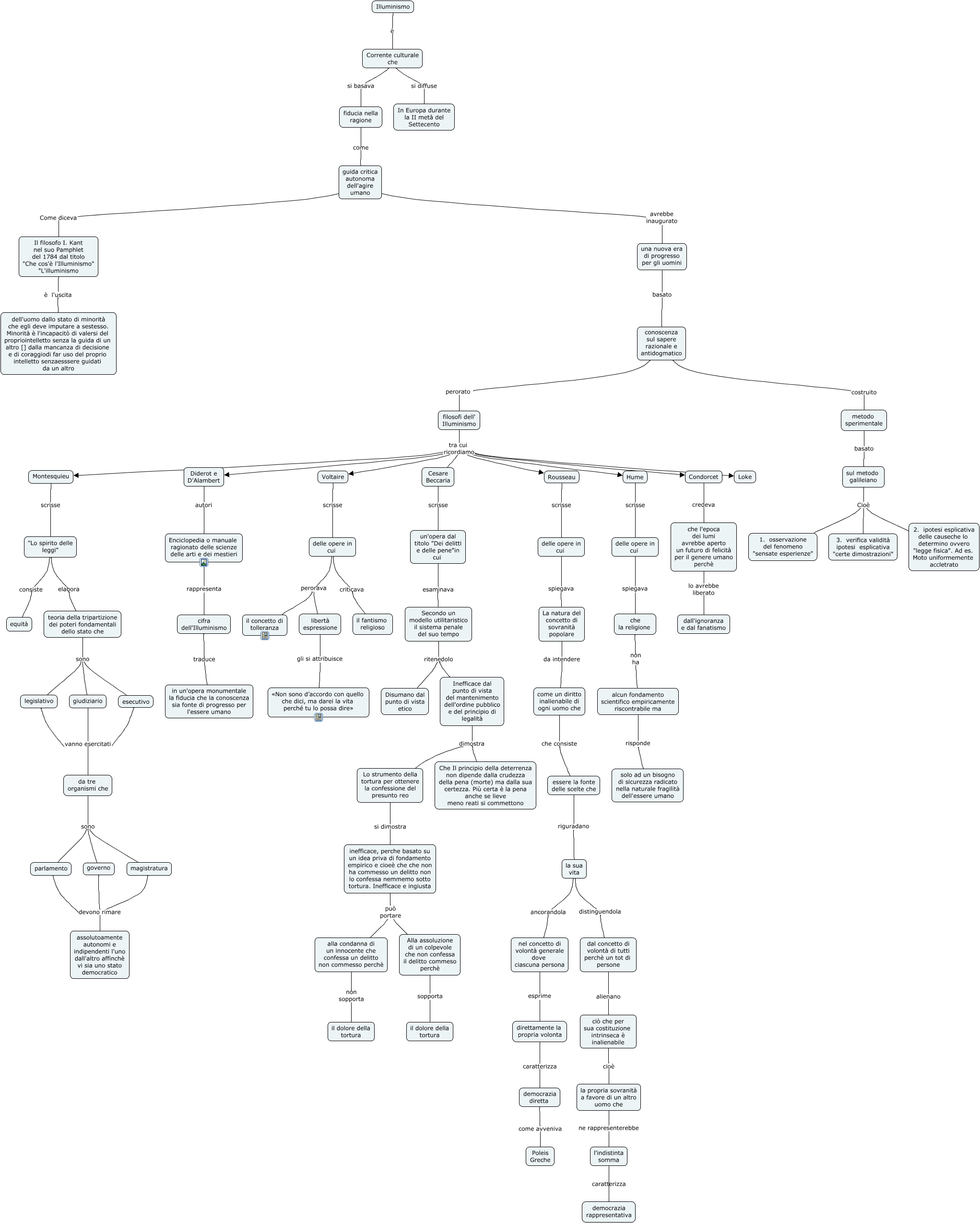 Questa Cmap, creata con IHMC CmapTools, contiene informazioni relative a: L'Illuminismo, Secondo un modello utilitaristico il sistema penale del suo tempo ritenedolo Disumano dal punto di vista etico, Condorcet credeva che l'epoca dei lumi avrebbe aperto un futuro di felicità per il genere umano perchè, Hume scrisse delle opere in cui, parlamento devono rimare assolutoamente autonomi e indipendenti l'uno dall'altro affinchè vi sia uno stato democratico, sul metodo galileiano Cioè 2. ipotesi esplicativa delle causeche lo determino ovvero "legge fisica". Ad es. Moto uniformemente accletrato, Il filosofo I. Kant nel suo Pamphlet del 1784 dal titolo "Che cos'è l'Illuminismo" "L'illuminismo è l'uscita dell'uomo dallo stato di minorità che egli deve imputare a sestesso. Minorità è l'incapacitò di valersi del propriointelletto senza la guida di un altro [] dalla mancanza di decisione e di coraggiodi far uso del proprio intelletto senzaesssere guidati da un altro, inefficace, perche basato su un idea priva di fondamento empirico e cioeè che che non ha commesso un delitto non lo confessa nemmemo sotto tortura. Inefficace e ingiusta può portare alla condanna di un innocente che confessa un delitto non commesso perchè, Rousseau scrisse delle opere in cui, sul metodo galileiano Cioè 1. osservazione del fenomeno "sensate esperienze", sul metodo galileiano Cioè 3. verifica validità ipotesi esplicativa "certe dimostrazioni", teoria della tripartizione dei poteri fondamentali dello stato che sono legislativo, governo devono rimare assolutoamente autonomi e indipendenti l'uno dall'altro affinchè vi sia uno stato democratico, Secondo un modello utilitaristico il sistema penale del suo tempo ritenedolo Inefficace dal punto di vista del mantenimento dell'ordine pubblico e del principio di legalità, delle opere in cui criticava il fantismo religioso, la sua vita distinguendola dal concetto di volontà di tutti perchè un tot di persone, un'opera dal titolo "Dei delitti e delle pene"in cui esaminava Secondo un modello utilitaristico il sistema penale del suo tempo, la propria sovranità a favore di un altro uomo che ne rappresenterebbe l'indistinta somma, filosofi dell' Illuminismo tra cui ricordiamo Cesare Beccaria, libertà espressione gli si attribuisce «Non sono d’accordo con quello che dici, ma darei la vita perché tu lo possa dire», legislativo vanno esercitati da tre organismi che