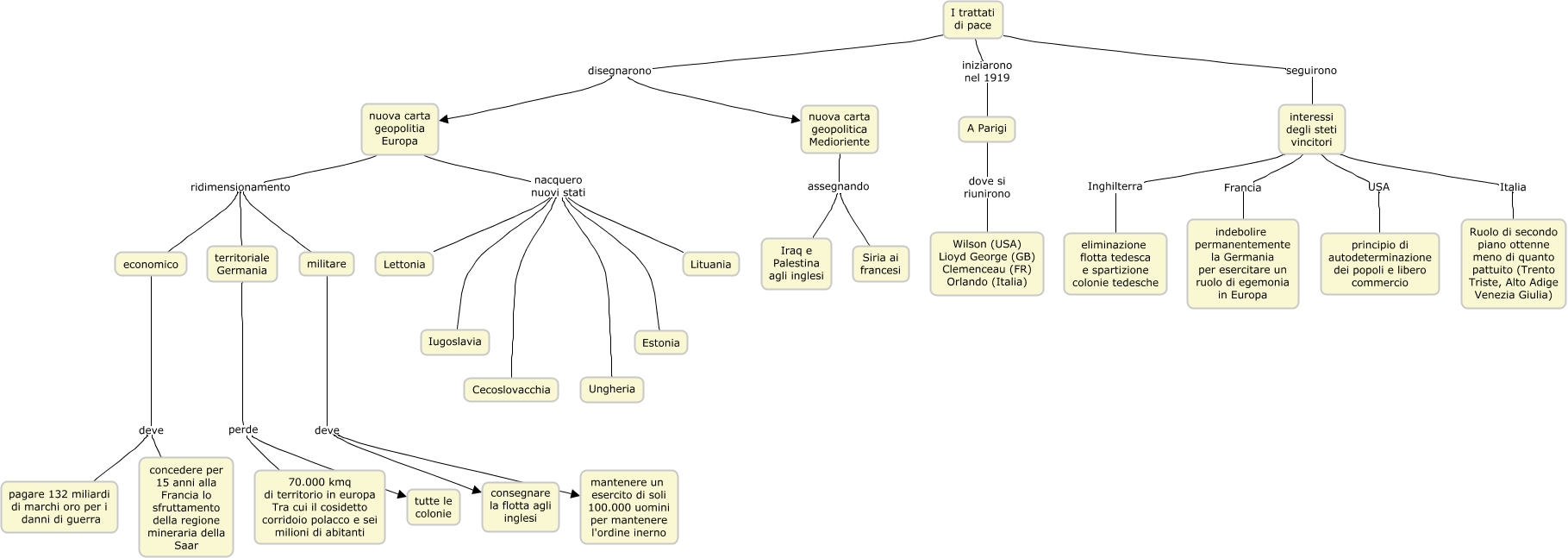 Questa Cmap, creata con IHMC CmapTools, contiene informazioni relative a: I trattati di pace, nuova carta geopolitia Europa nacquero nuovi stati Cecoslovacchia, nuova carta geopolitica Medioriente assegnando Iraq e Palestina agli inglesi, nuova carta geopolitia Europa ridimensionamento territoriale Germania, interessi degli steti vincitori Italia Ruolo di secondo piano ottenne meno di quanto pattuito (Trento Triste, Alto Adige Venezia Giulia), economico deve concedere per 15 anni alla Francia lo sfruttamento della regione mineraria della Saar, interessi degli steti vincitori Inghilterra eliminazione flotta tedesca e spartizione colonie tedesche, economico deve pagare 132 miliardi di marchi oro per i danni di guerra, I trattati di pace disegnarono nuova carta geopolitia Europa, I trattati di pace disegnarono nuova carta geopolitica Medioriente, nuova carta geopolitia Europa nacquero nuovi stati Ungheria, interessi degli steti vincitori Francia indebolire permanentemente la Germania per esercitare un ruolo di egemonia in Europa, nuova carta geopolitia Europa nacquero nuovi stati Lettonia, A Parigi dove si riunirono Wilson (USA) Lioyd George (GB) Clemenceau (FR) Orlando (Italia), territoriale Germania perde tutte le colonie, nuova carta geopolitia Europa nacquero nuovi stati Lituania, nuova carta geopolitia Europa ridimensionamento economico, territoriale Germania perde 70.000 kmq di territorio in europa Tra cui il cosidetto corridoio polacco e sei milioni di abitanti, militare deve consegnare la flotta agli inglesi, nuova carta geopolitia Europa nacquero nuovi stati Estonia, interessi degli steti vincitori USA principio di autodeterminazione dei popoli e libero commercio