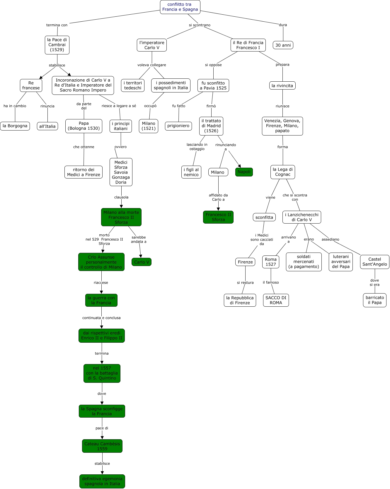 Questa Cmap, creata con IHMC CmapTools, contiene informazioni relative a: La rivalita franco spagnola nel 500, conflitto tra Francia e Spagna dura 30 anni, il trattato di Madrid (1526) rinunciando a Napoli, Milano alla morte Francesco II Sforza sarebbe andata a Carlo V, sconfitta i Medici sono cacciati da Firenze, i principi italiani ovvero Medici Sforza Savoia Gonzaga Doria, la Spagna sconfigge la Francia pace di Cateau Cambèsis 1559, i Lanzichenecchi di Carlo V arrivano a Roma 1527, il Re di Francia Francesco I prepara la rivincita, Incoronazione di Carlo V a Re d'Italia e Imperatore del Sacro Romano Impero da parte del Papa (Bologna 1530), Re francese rinuncia all'Italia, l'imperatore Carlo V voleva collegare i territori tedeschi, la guerra con la Francia continuata e conclusa dai rispettivi eredi Enrico II e Filippo II, il trattato di Madrid (1526) rinunciando a Milano, Crlo Assunse personalmente il controllo di Milano riaccese la guerra con la Francia, il trattato di Madrid (1526) lasciando in ostaggio i figli al nemico, la Lega di Cognac viene sconfitta, conflitto tra Francia e Spagna termina con la Pace di Cambrai (1529), Incoronazione di Carlo V a Re d'Italia e Imperatore del Sacro Romano Impero riesce a legare a sé i principi italiani, i Lanzichenecchi di Carlo V assediano Castel Sant'Angelo, l'imperatore Carlo V voleva collegare i possedimenti spagnoli in Italia