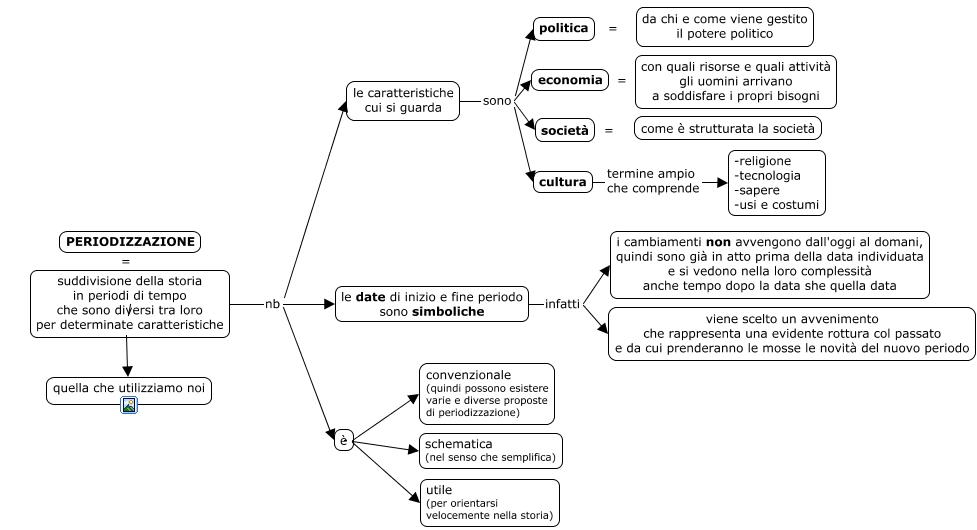 Questa Cmap, creata con IHMC CmapTools, contiene informazioni relative a: 00_periodizzazione, suddivisione della storia in periodi di tempo che sono diversi tra loro per determinate caratteristiche nb le caratteristiche cui si guarda, economia = con quali risorse e quali attività gli uomini arrivano a soddisfare i propri bisogni, le date di inizio e fine periodo sono simboliche infatti i cambiamenti non avvengono dall'oggi al domani, quindi sono già in atto prima della data individuata e si vedono nella loro complessità anche tempo dopo la data she quella data, suddivisione della storia in periodi di tempo che sono diversi tra loro per determinate caratteristiche nb le date di inizio e fine periodo sono simboliche, le caratteristiche cui si guarda sono politica, le caratteristiche cui si guarda sono società, politica = da chi e come viene gestito il potere politico, suddivisione della storia in periodi di tempo che sono diversi tra loro per determinate caratteristiche nb è, è utile (per orientarsi velocemente nella storia), suddivisione della storia in periodi di tempo che sono diversi tra loro per determinate caratteristiche quella che utilizziamo noi, le date di inizio e fine periodo sono simboliche infatti viene scelto un avvenimento che rappresenta una evidente rottura col passato e da cui prenderanno le mosse le novità del nuovo periodo, le caratteristiche cui si guarda sono economia, le caratteristiche cui si guarda sono cultura, società = come è strutturata la società, cultura termine ampio che comprende -religione -tecnologia -sapere -usi e costumi, è convenzionale (quindi possono esistere varie e diverse proposte di periodizzazione), è schematica (nel senso che semplifica)