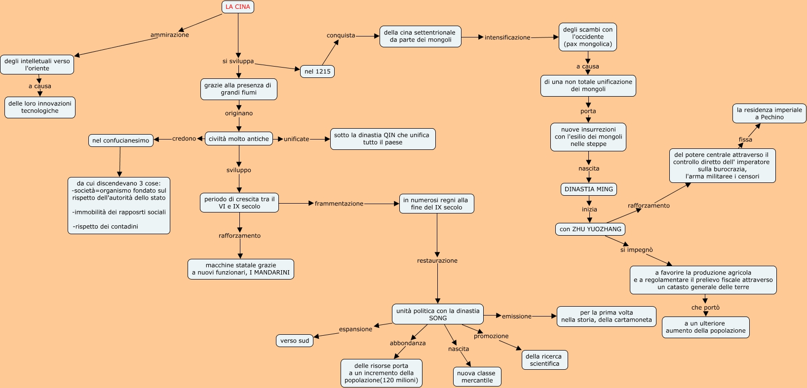Questa Cmap, creata con IHMC CmapTools, contiene informazioni relative a: LA CINA 3als, unità politica con la dinastia SONG emissione per la prima volta nella storia, della cartamoneta, di una non totale unificazione dei mongoli porta nuove insurrezioni con l'esilio dei mongoli nelle steppe, LA CINA si sviluppa nel 1215, degli intelletuali verso l'oriente a causa delle loro innovazioni tecnologiche, a favorire la produzione agricola e a regolamentare il prelievo fiscale attraverso un catasto generale delle terre che portò a un ulteriore aumento della popolazione, degli scambi con l'occidente (pax mongolica) a causa di una non totale unificazione dei mongoli, civiltà molto antiche credono nel confucianesimo, unità politica con la dinastia SONG nascita nuova classe mercantile, nel 1215 conquista della cina settentrionale da parte dei mongoli, in numerosi regni alla fine del IX secolo restaurazione unità politica con la dinastia SONG, con ZHU YUOZHANG si impegnò a favorire la produzione agricola e a regolamentare il prelievo fiscale attraverso un catasto generale delle terre, civiltà molto antiche sviluppo periodo di crescita tra il VI e IX secolo, LA CINA si sviluppa grazie alla presenza di grandi fiumi, unità politica con la dinastia SONG promozione della ricerca scientifica, nel confucianesimo ???? da cui discendevano 3 cose: -società=organismo fondato sul rispetto dell'autorità dello stato -immobilità dei rapposrti sociali -rispetto dei contadini, periodo di crescita tra il VI e IX secolo rafforzamento macchine statale grazie a nuovi funzionari, I MANDARINI, con ZHU YUOZHANG rafforzamento del potere centrale attraverso il controllo diretto dell' imperatore sulla burocrazia, l'arma militaree i censori, della cina settentrionale da parte dei mongoli intensificazione degli scambi con l'occidente (pax mongolica), grazie alla presenza di grandi fiumi originano civiltà molto antiche, civiltà molto antiche unificate sotto la dinastia QIN che unifica tutto il paese