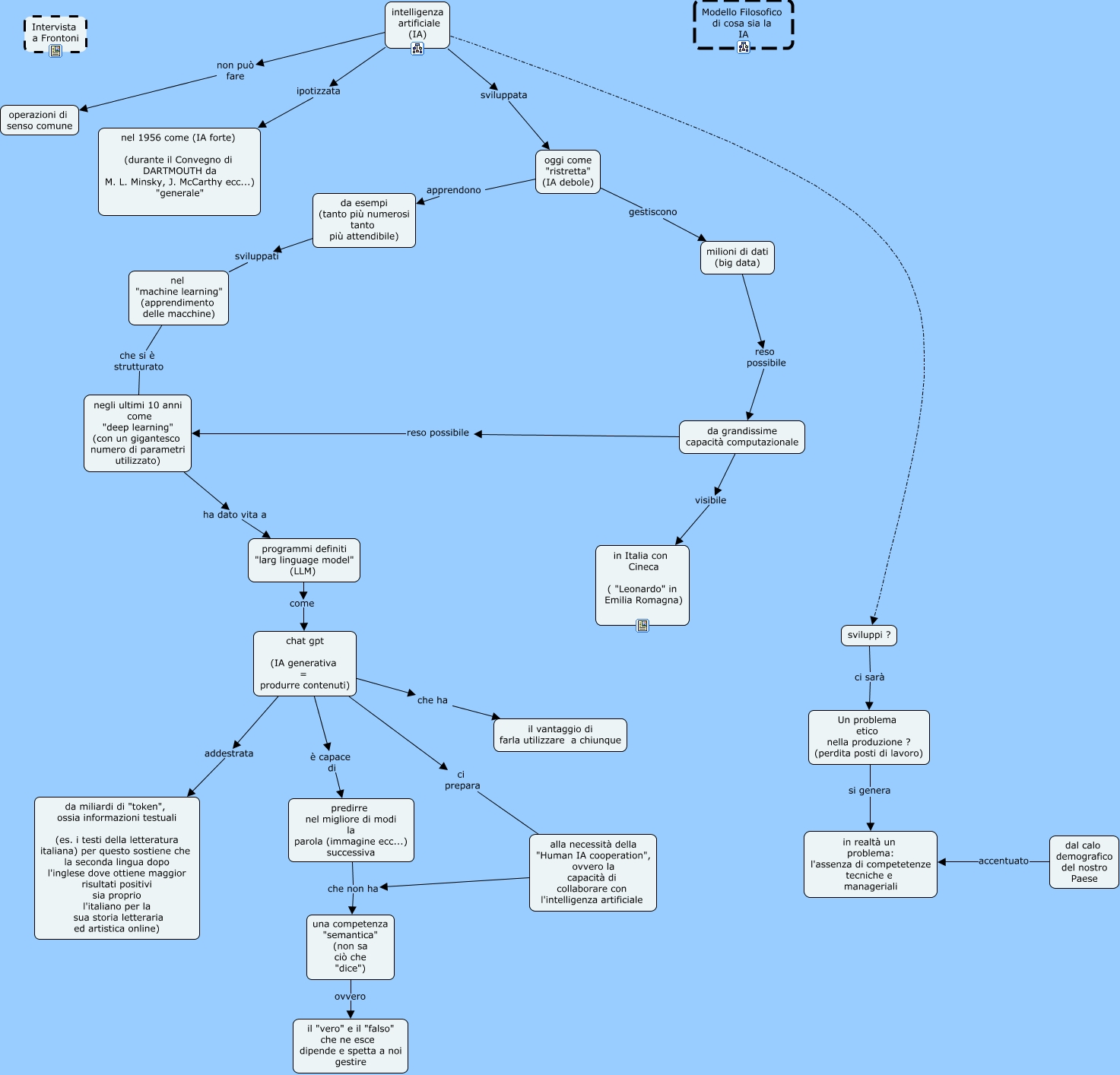 Questa Cmap, creata con IHMC CmapTools, contiene informazioni relative a: IA per Frontoni, nel "machine learning" (apprendimento delle macchine) che si è strutturato negli ultimi 10 anni come "deep learning" (con un gigantesco numero di parametri utilizzato), oggi come "ristretta" (IA debole) gestiscono milioni di dati (big data), intelligenza artificiale (IA) sviluppata oggi come "ristretta" (IA debole), negli ultimi 10 anni come "deep learning" (con un gigantesco numero di parametri utilizzato) ha dato vita a programmi definiti "larg linguage model" (LLM), una competenza "semantica" (non sa ciò che "dice") ovvero il "vero" e il "falso" che ne esce dipende e spetta a noi gestire, chat gpt (IA generativa = produrre contenuti) addestrata da miliardi di "token", ossia informazioni testuali (es. i testi della letteratura italiana) per questo sostiene che la seconda lingua dopo l'inglese dove ottiene maggior risultati positivi sia proprio l'italiano per la sua storia letteraria ed artistica online), da esempi (tanto più numerosi tanto più attendibile) sviluppati nel "machine learning" (apprendimento delle macchine), intelligenza artificiale (IA) non può fare operazioni di senso comune, dal calo demografico del nostro Paese accentuato in realtà un problema: l'assenza di competetenze tecniche e manageriali, milioni di dati (big data) reso possibile da grandissime capacità computazionale, oggi come "ristretta" (IA debole) apprendono da esempi (tanto più numerosi tanto più attendibile), chat gpt (IA generativa = produrre contenuti) è capace di predirre nel migliore di modi la parola (immagine ecc...) successiva, chat gpt (IA generativa = produrre contenuti) che ha il vantaggio di farla utilizzare a chiunque, chat gpt (IA generativa = produrre contenuti) ci prepara alla necessità della "Human IA cooperation", ovvero la capacità di collaborare con l'intelligenza artificiale, programmi definiti "larg linguage model" (LLM) come chat gpt (IA generativa = produrre contenuti), da grandissime capacità computazionale visibile in Italia con Cineca ( "Leonardo" in Emilia Romagna), intelligenza artificiale (IA) ipotizzata nel 1956 come (IA forte) (durante il Convegno di DARTMOUTH da M. L. Minsky, J. McCarthy ecc...) "generale", alla necessità della "Human IA cooperation", ovvero la capacità di collaborare con l'intelligenza artificiale che non ha una competenza "semantica" (non sa ciò che "dice"), da grandissime capacità computazionale reso possibile negli ultimi 10 anni come "deep learning" (con un gigantesco numero di parametri utilizzato), intelligenza artificiale (IA) sviluppi ?