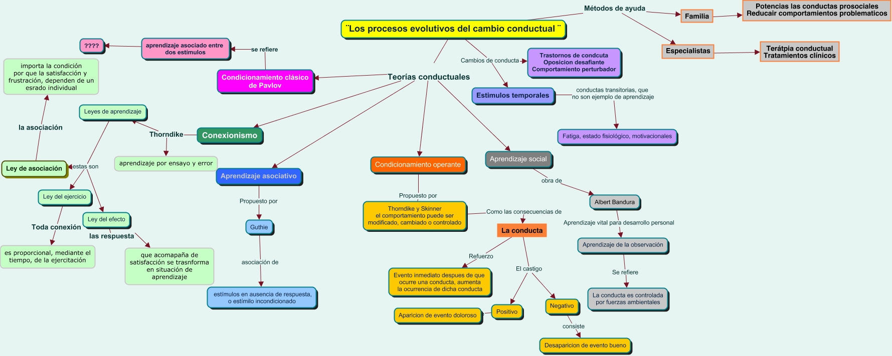 This Concept Map, created with IHMC CmapTools, has information related to: CONDUCTA, Condicionamiento clásico de Pavlov se refiere aprendizaje asociado entre dos estímulos, Ley del efecto las respuesta que acomapaña de satisfacción se trasnforma en situación de aprendizaje, ¨Los procesos evolutivos del cambio conductual ¨ Teorías conductuales Condicionamiento operante, ¨Los procesos evolutivos del cambio conductual ¨ Teorías conductuales Condicionamiento clásico de Pavlov, ¨Los procesos evolutivos del cambio conductual ¨ Cambios de conducta Trastornos de condcuta Oposicion desafiante Comportamiento perturbador, Ley del ejercicio Toda conexión es proporcional, mediante el tiempo, de la ejercitación, Conexionismo Thorndike Leyes de aprendizaje, ¨Los procesos evolutivos del cambio conductual ¨ Teorías conductuales Aprendizaje social, La conducta El castigo Positivo, Negativo consiste Desaparicion de evento bueno, ¨Los procesos evolutivos del cambio conductual ¨ Teorías conductuales Aprendizaje asociativo, aprendizaje asociado entre dos estímulos ???? ????, Leyes de aprendizaje estas son Ley del ejercicio, La conducta El castigo Negativo, Condicionamiento operante Propuesto por Thorndike y Skinner el comportamiento puede ser modificado, cambiado o controlado, Leyes de aprendizaje estas son Ley del efecto, Leyes de aprendizaje estas son Ley de asociación, Positivo Consiste Aparicion de evento doloroso, ¨Los procesos evolutivos del cambio conductual ¨ Cambios de conducta Estimulos temporales, La conducta Refuerzo Evento inmediato despues de que ocurre una conducta, aumenta la ocurrencia de dicha conducta