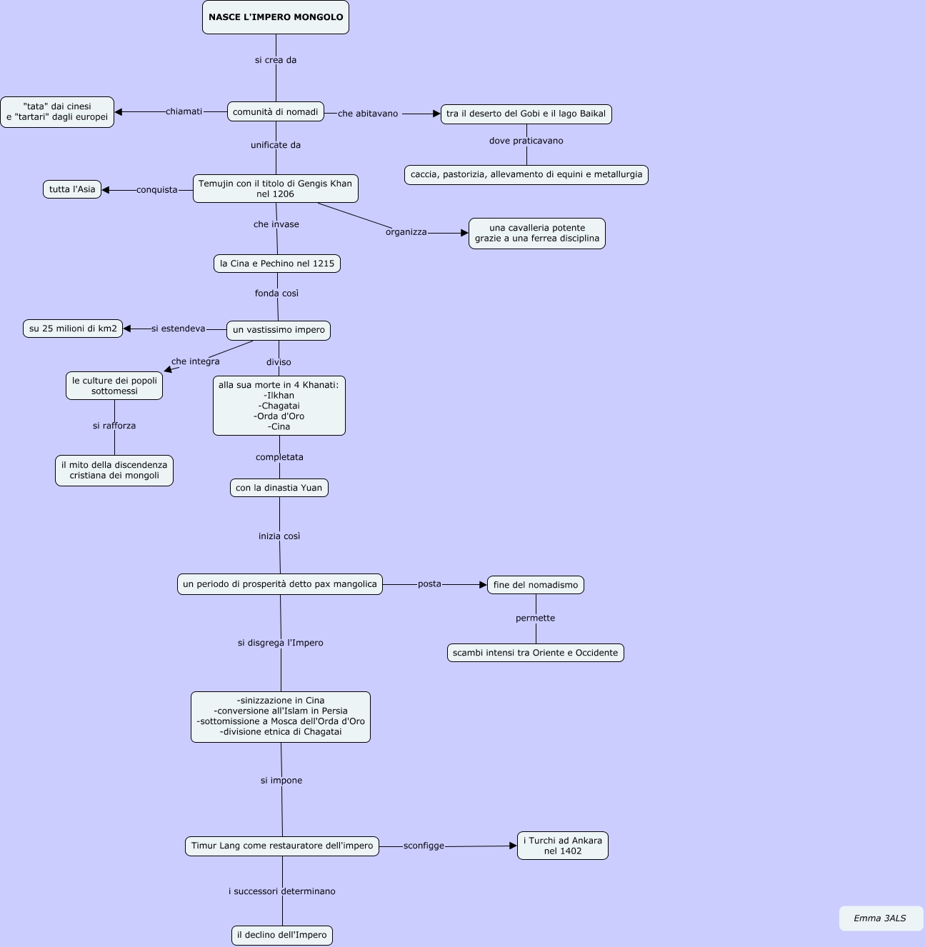 Questa Cmap, creata con IHMC CmapTools, contiene informazioni relative a: Nasce l'impero mongolo, alla sua morte in 4 Khanati: -Ilkhan -Chagatai -Orda d'Oro -Cina completata con la dinastia Yuan, comunità di nomadi unificate da Temujin con il titolo di Gengis Khan nel 1206, un vastissimo impero diviso alla sua morte in 4 Khanati: -Ilkhan -Chagatai -Orda d'Oro -Cina, comunità di nomadi chiamati "tata" dai cinesi e "tartari" dagli europei, un periodo di prosperità detto pax mangolica posta fine del nomadismo, le culture dei popoli sottomessi si rafforza il mito della discendenza cristiana dei mongoli, Temujin con il titolo di Gengis Khan nel 1206 che invase la Cina e Pechino nel 1215, un vastissimo impero che integra le culture dei popoli sottomessi, tra il deserto del Gobi e il lago Baikal dove praticavano caccia, pastorizia, allevamento di equini e metallurgia, Timur Lang come restauratore dell'impero sconfigge i Turchi ad Ankara nel 1402, Temujin con il titolo di Gengis Khan nel 1206 conquista tutta l'Asia, un vastissimo impero si estendeva su 25 milioni di km2, la Cina e Pechino nel 1215 fonda così un vastissimo impero, NASCE L'IMPERO MONGOLO si crea da comunità di nomadi, con la dinastia Yuan inizia così un periodo di prosperità detto pax mangolica, comunità di nomadi che abitavano tra il deserto del Gobi e il lago Baikal, Timur Lang come restauratore dell'impero i successori determinano il declino dell'Impero, Temujin con il titolo di Gengis Khan nel 1206 organizza una cavalleria potente grazie a una ferrea disciplina, -sinizzazione in Cina -conversione all'Islam in Persia -sottomissione a Mosca dell'Orda d'Oro -divisione etnica di Chagatai si impone Timur Lang come restauratore dell'impero, fine del nomadismo permette scambi intensi tra Oriente e Occidente