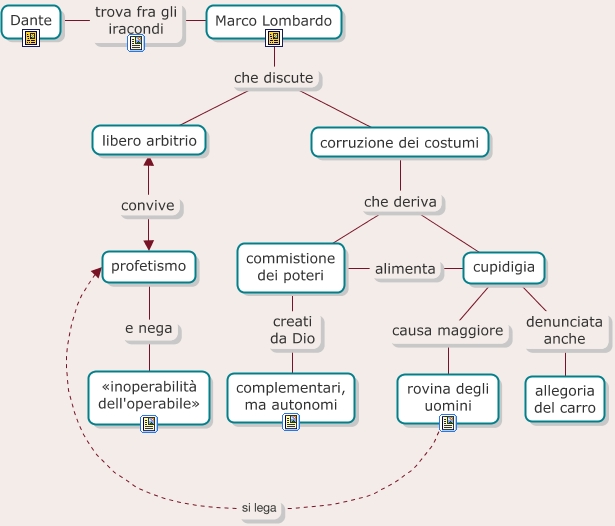 Questa Cmap, creata con IHMC CmapTools, contiene informazioni relative a: «A maggior forza e a miglior natura», profetismo e nega «inoperabilità dell'operabile», cupidigia denunciata anche allegoria del carro, rovina degli uomini si lega profetismo, cupidigia causa maggiore rovina degli uomini, Marco Lombardo che discute libero arbitrio, Marco Lombardo che discute corruzione dei costumi, commistione dei poteri alimenta cupidigia, commistione dei poteri creati da Dio complementari, ma autonomi, Dante trova fra gli iracondi Marco Lombardo