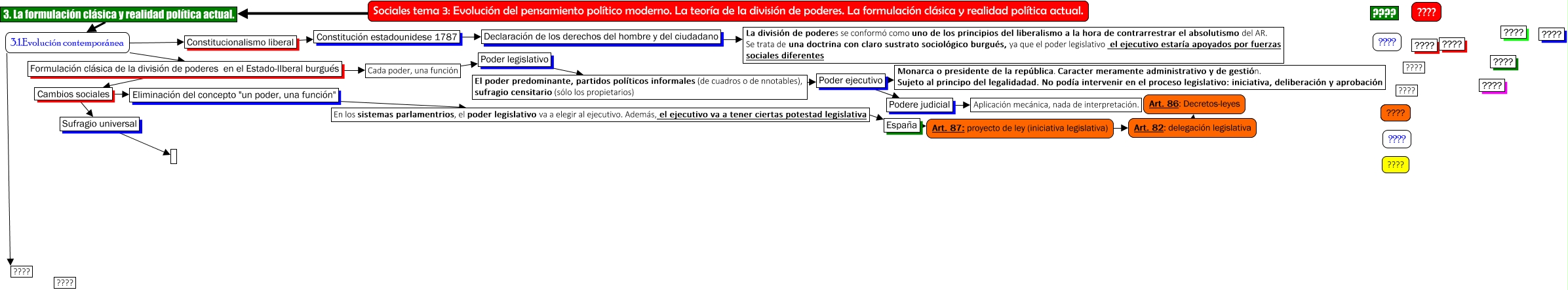Este Cmap, tiene información relacionada con: Tema 03.2. Evolución del pensamiento político moderno. La teroía de la división de poderes. La formulación clásica y realidad política actual, Constitución estadounidese 1787 Declaración de los derechos del hombre y del ciudadano, 3.1.Evolución contemporánea Constitucionalismo liberal, El poder predominante, partidos políticos informales (de cuadros o de nnotables), sufragio censitario (sólo los propietarios) Poder ejecutivo, Constitucionalismo liberal Constitución estadounidese 1787, Poder ejecutivo Podere judicial, Poder legislativo El poder predominante, partidos políticos informales (de cuadros o de nnotables), sufragio censitario (sólo los propietarios), Eliminación del concepto "un poder, una función" En los sistemas parlamentrios, el poder legislativo va a elegir al ejecutivo. Además, el ejecutivo va a tener ciertas potestad legislativa, Formulación clásica de la división de poderes en el Estado-lIberal burgués Cambios sociales, Formulación clásica de la división de poderes en el Estado-lIberal burgués Cada poder, una función, Cambios sociales Eliminación del concepto "un poder, una función", Cada poder, una función Poder legislativo, Sociales tema 3: Evolución del pensamiento político moderno. La teoría de la división de poderes. La formulación clásica y realidad política actual. 3. La formulación clásica y realidad política actual., Podere judicial Aplicación mecánica, nada de interpretación., Sufragio universal, Declaración de los derechos del hombre y del ciudadano La división de poderes se conformó como uno de los principios del liberalismo a la hora de contrarrestrar el absolutismo del AR. Se trata de una doctrina con claro sustrato sociológico burgués, ya que el poder legislativo el ejecutivo estaría apoyados por fuerzas sociales diferentes, 3.1.Evolución contemporánea ????, 3. La formulación clásica y realidad política actual. 3.1.Evolución contemporánea, Cambios sociales Sufragio universal, En los sistemas parlamentrios, el poder legislativo va a elegir al ejecutivo. Además, el ejecutivo va a tener ciertas potestad legislativa España, Poder ejecutivo Monarca o presidente de la república. Caracter meramente administrativo y de gestión. Sujeto al principo del legalidadad. No podía intervenir en el proceso legislativo: iniciativa, deliberación y aprobación