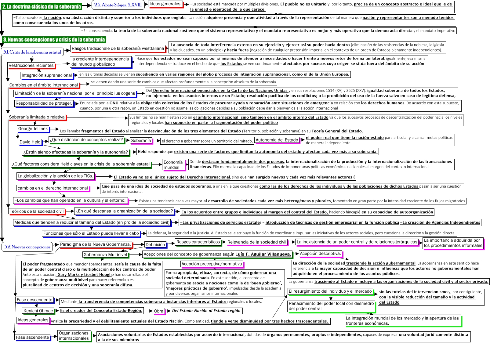 Este Cmap, tiene información relacionada con: Tema 02.2 La soberanía y el poder del Estado. La doctrina clásica de la soberanía. Nuevas concepciones y crisis de la soberanía estatal, − La sociedad está marcada por múltiples divisiones. El pueblo no es unitario y, por lo tanto, precisa de un concepto abstracto e ideal que le de la unidad e identidad de la que carece. − Tal concepto es la nación, una abstracción distinta y superior a los individuos que engloba. La nación adquiere presencia y operatividad a través de la representación de tal manera que nación y representantes son a menudo tenidos como consecuencia los unos de los otros., Cambios en el ámbito internacional Soberanía limitada o relativa, Acepción preceptiva/normativa Forma apropiada, eficaz, correcta, de cómo gobernar una sociedad determinada. En este sentido, el concepto de gobernanza se asocia a nociones como la de ‘buen gobierno’, ‘mejores prácticas de gobierno’, impulsadas desde la academia y por diversos organismos internacionales, − Los cambios que han operado en la cultura y el entorno: Existe una tendencia cada vez mayor al desarrollo de sociedades cada vez más heterogéneas y plurales, fomentado en gran parte por la intensidad creciente de los flujos migratorios, David Held ¿Qué distinción de conceptos realiza?, Acepción descriptiva. La dirección de la sociedad trasciende la acción gubernamental. La gobernanza en este sentido hace referencia a la mayor capacidad de decisión e influencia que los actores no gubernamentales han adquirido en el procesamiento de los asuntos públicos., El resurgimiento del individuo y el mercado sin las tutelas del intervencionismo y, por consiguiente, con la visible reducción del tamaño y la actividad del Estado, Medidas que tienden a reducir el tamaño del Estado (en pro de la sociedad civil) Funciones que sólo el Estado puede llevar a cabo, George Jellinek Los llamaba fragmentos del Estado al analizar la desvinculación de los tres elementos del Estado (Territorio, población y soberanía) en su Teoría General del Estado., Soberanía el derecho a gobernar sobre un territorio delimitado,, Soberanía limitada o relativa Sus límites no se manifiestan sólo en el ámbito internacional, sino también en el ámbito interno del Estado ya que los sucesivos procesos de descentralización del poder hacia los niveles regionales y locales han supuesto en parte la fragmentación del poder político, Definición Gobernanza Multinivel, Kenichi Ohmae Es el creador del Concepto Estado-Región., El resurgimiento del individuo y el mercado Renacimiento del poder local con desmedro del poder central, el derecho a gobernar sobre un territorio delimitado, Autonomía del Estado, ¿Qué distinción de conceptos realiza? Soberanía, 3.1. Crisis de la soberanía estatal Rasgos tradicionale de la soberanía westfaliana, Funciones que sólo el Estado puede llevar a cabo La defensa, la seguridad o la justicia. Al Estado se le atribuye la función de coordinar e impulsar las iniciativas de los actores sociales, pero cuestiona la dirección y la gestión directa., Cambios en el ámbito internacional Limitación de la soberanía nacional por el principio ius cogens, Teóricos de la sociedad civil ¿En qué descansa la organización de la sociedad?