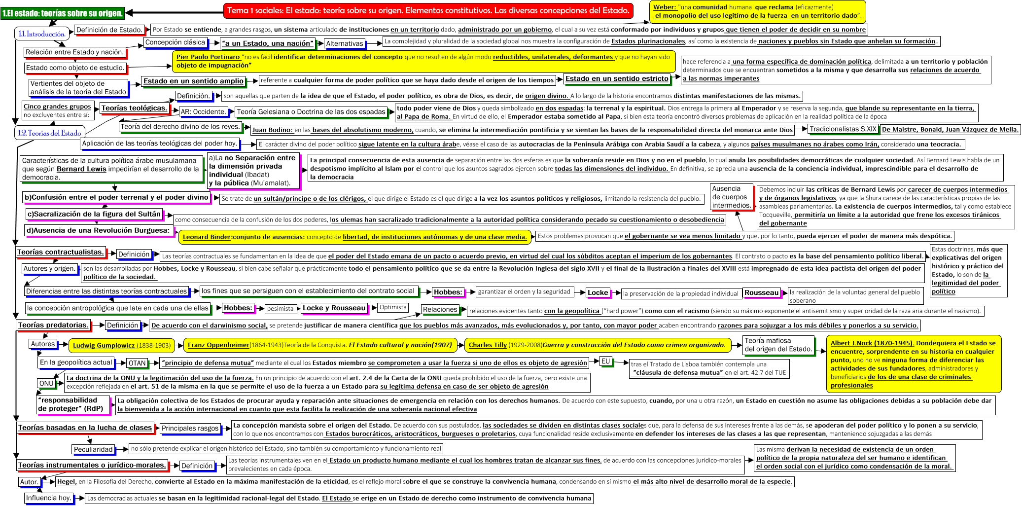 Este Cmap, tiene información relacionada con: Tema 01. El estado. Teorías sobre su origen. Elementos constitutivos. Las diversas concepciones del Estado, Por Estado se entiende, a grandes rasgos, un sistema articulado de instituciones en un territorio dado, administrado por un gobierno, el cual a su vez está conformado por individuos y grupos que tienen el poder de decidir en su nombre Weber: "una comunidad humana que reclama (eficazmente) el monopolio del uso legítimo de la fuerza en un territorio dado”., Teorías instrumentales o jurídico-morales. Definición, los fines que se persiguen con el establecimiento del contrato social Hobbes:, b) Confusión entre el poder terrenal y el poder divino Se trate de un sultán/príncipe o de los clérigos, el que dirige el Estado es el que dirige a la vez los asuntos políticos y religiosos, limitando la resistencia del pueblo., Diferencias entre las distintas teorías contractuales la concepción antropológica que late en cada una de ellas, Cinco grandes grupos no excluyentes entre sí: Teorías teológicas., a) La no Separación entre la dimensión privada individual (Ibadat) y la pública (Mu’amalat). La principal consecuencia de esta ausencia de separación entre las dos esferas es que la soberanía reside en Dios y no en el pueblo, lo cual anula las posibilidades democráticas de cualquier sociedad. Así Bernard Lewis habla de un despotismo implícito al Islam por el control que los asuntos sagrados ejercen sobre todas las dimensiones del individuo. En definitiva, se aprecia una ausencia de la conciencia individual, imprescindible para el desarrollo de la democracia, AR: Occidente. Teoría Gelesiana o Doctrina de las dos espadas, Teoría del derecho divino de los reyes. Juan Bodino: en las bases del absolutismo moderno, cuando, se elimina la intermediación pontificia y se sientan las bases de la responsabilidad directa del monarca ante Dios, Franz Oppenheimer(1864-1943)Teoría de la Conquista. El Estado cultural y nación(1907) Charles Tilly (1929-2008)Guerra y construcción del Estado como crimen organizado., Definición Las teorías instrumentales ven en el Estado un producto humano mediante el cual los hombres tratan de alcanzar sus fines, de acuerdo con las concepciones jurídico-morales prevalecientes en cada época., Locke y Rousseau Optimista, Teorías predatorias. Autores, Teoría mafiosa del origen del Estado. Albert J.Nock (1870-1945). Dondequiera el Estado se encuentre, sorprendente en su historia en cualquier punto, uno no ve ninguna forma de diferenciar las actividades de sus fundadores, administradores y beneficiarios de los de una clase de criminales profesionales, la concepción antropológica que late en cada una de ellas Hobbes:, c) Sacralización de la figura del Sultán como consecuencia de la confusión de los dos poderes, los ulemas han sacralizado tradicionalmente a la autoridad política considerando pecado su cuestionamiento o desobediencia, De acuerdo con el darwinismo social, se pretende justificar de manera científica que los pueblos más avanzados, más evolucionados y, por tanto, con mayor poder acaben encontrando razones para sojuzgar a los más débiles y ponerlos a su servicio. Relaciones, Autor. Influencia hoy., ONU “responsabilidad de proteger” (RdP), Alternativas La complejidad y pluralidad de la sociedad global nos muestra la configuración de Estados plurinacionales, así como la existencia de naciones y pueblos sin Estado que anhelan su formación,.