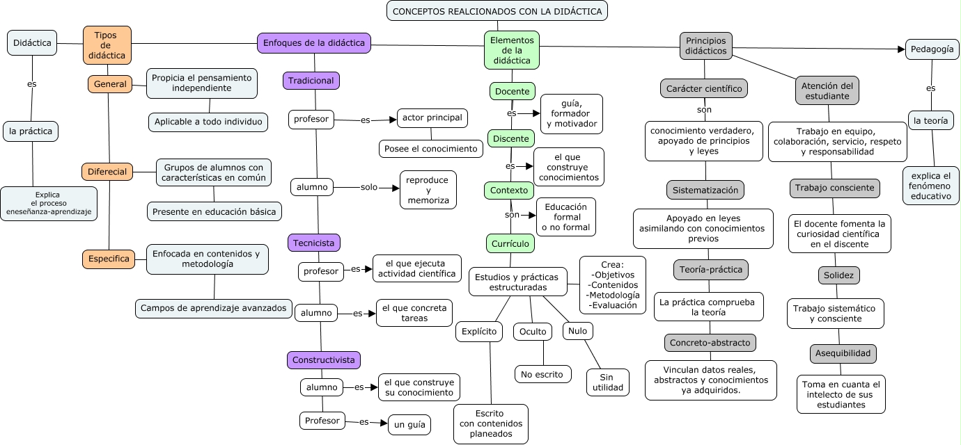 Este Cmap, tiene información relacionada con: Conceptos relacionados con la didáctica, alumno es el que construye su conocimiento, Grupos de alumnos con características en común ???? Presente en educación básica, Enfocada en contenidos y metodología ???? Campos de aprendizaje avanzados, profesor es actor principal, Estudios y prácticas estructuradas ???? Crea: -Objetivos -Contenidos -Metodología -Evaluación, No escrito ???? Oculto, Pedagogía es la teoría, la teoría ???? explica el fenómeno educativo, Docente es guía, formador y motivador, Nulo ???? Sin utilidad, profesor es el que ejecuta actividad científica, Estudios y prácticas estructuradas ???? Oculto, Sistematización ???? Vinculan datos reales, abstractos y conocimientos ya adquiridos., Discente es el que construye conocimientos, Enfoques de la didáctica ???? Tipos de didáctica, Currículo ???? Estudios y prácticas estructuradas, alumno solo reproduce y memoriza, actor principal ???? Posee el conocimiento, Enfoques de la didáctica ???? Pedagogía, Didáctica ???? Tipos de didáctica